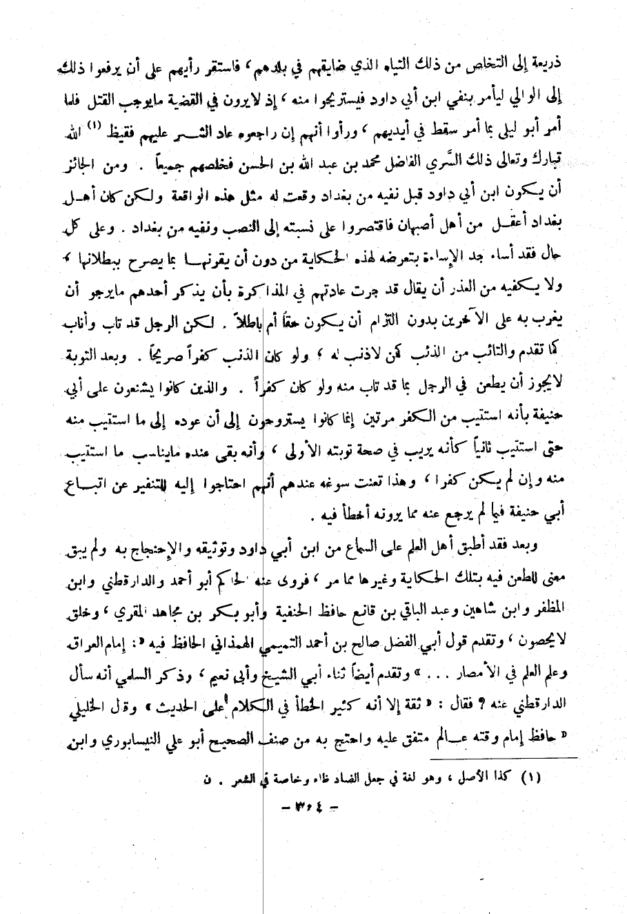 ذريعة إلى التخلص من ذلك التياه الذي ضايقهم في بلدهم ، فاستقر رأيهم على أن يرفعوا ذلك إلى الوالي ليأمر بنفي ابن أبي داود فيستريحوا منه ، إذ لا يرون في القضية م يوجب القتل فلما مر أبو ليلى بما أمر سقط في أيديهم ، رأوا أنهم إن راجعوه عاد الشر عليهم فقيظ (1) الله تبارك وتعالى ذلك السّري الفاضل محمد بن عبد الله بن الحسن فخلصهم جميعاً . ومن الجائز أن يكون ابن أبي دود قبل نفيه من بغداد وقعت له مثل هذه الواقعة ولكن كان أهل بغداد أعقل من أهل أصبهان فاقتصروا على نسبته إلى النصب ونفيه من بغداد . وعلى كل حال فقد أساء جد الإساءة بتعرضه لهذه الحكاية من دون أن يقرنها بما يصرح ببطلانها ، ولا يكفيه من العذر أن يقال قد جرت عادتهم في المذاكرة بأن يذكر أحدهم من يرجوا أن يغرب به على الآخرين بدون التزام أن يكون حقاً أم باطلاً . لكن الرجل قد تاب وأناب كما تقدم والتائب من الذنب كمن لا ذنب له ، ولو كان الذنب كفراً صريحاً . وبعد التوبة لا يجوز الطعن في الرجل بما قد تاب منه ولو كان كفراً. والذين كانوا يشنعون على أبي حنيفة بأنه استتيب من الكفر مرتين إنما كانوا يسترحون إلى أن عوده إلى ما استتيب منه حتى استتيب ثانياً كأنه يريب في صحة توبته الأولى ، وأنه بقي عنده ما يناسب ما استتيب منه وإن لم يكن كفراً ، وهذا تعنت سوغه عندهم أنهم احتاجوا إليه للتنفير عن أتباع أبي حنيفة فيما لم يرجع عنه مما يرونه أخطأ فيه .