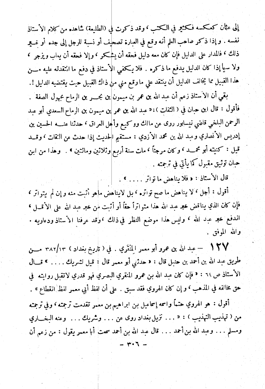 127- عبد الله بن عمرو أبو معمر المنقري . في ( تاريخ بغداد ) 13/382 من طريق عبد الله بن أحمد بن حنبل قال : (( حدثني أبو معمر قال : قيل لشريك ... )) قال الأستاذ ص64 : (( فإن كان عبد الله بن عمرو المنقري البصري فهو قدري لا تقبل روايته في حق مخالفه في المذهب ، وإن كان الهروي فقد سبق . على أن لفظ أبي معمر لفظ انقطاع )) .