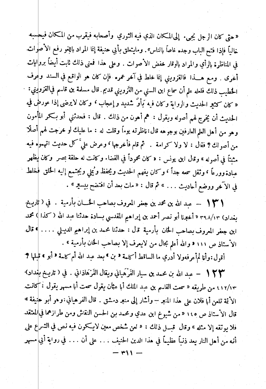 123- عبد الله بن محمد بن سيار الفرهياني ويقال الفرْهاذاني . في ( تاريخ بغداد ) الأئمة تلعن أبا فلان على هذا المنبر - وأشار إلى منبر دمشق . قال الفرهياني : وهو أبو حنيفة )) قال الأستاذ ص145 (( من شيوخ ابن عدي ومحمد بن الحسن النقاش وم طرازهما في المعتقد فلا يوثقه إلا مثله )) قال قبل ذلك : (( لعن شخص معين لا يكون فيه نص في الشرع على أنه من أهل النار يعد ذنباً عظيماً في هذا الدين الحنيف ... على أن ... في رواية أبي مسهر