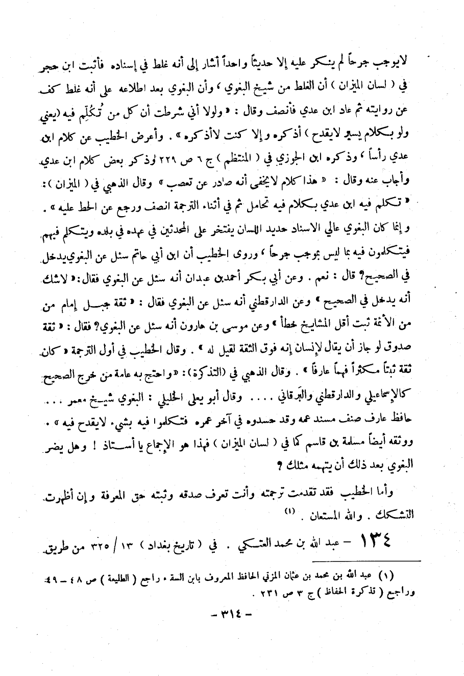لا يوجب جرحاً لم ينكر عليه إلا حديثاً واحداً أشار إلى أنه غلط في إسناده فأثبت ابن حجر في ( لسان الميزان ) أن الغلط من شيخ البغوي ، وأن البغوي بعد اطلاعه على أنه غلط كف عن روايته ثم عاد ابن عدي فأنصف وقال : (( ولولا أني شرطت أن كل من تُكُلِّمَ فيه ( يعني ولو بكلام يسير لا يقدح ) أذكره أذكره وإلا كنت لا أذكره )) . وأعرض الخطيب عن كلام ابن عدي رأساً ، وذكره ابن الجوزي في ( المنتظم ) ج6 ص229 وذكر بعض كلام ابن عدي وأجاب عنه وقال : (( هذا كلام لا يخفى أنه صادر عن تعصب )) وقال الذهبي في ( الميزان ) : (( تكلم فيه ابن عدي بكلام فيه تحامل ثم في أثناء الترجمة انصف ورجع عن الحط عليه )) . وإنما كان البغوي عالي الإسناد حديد اللسان يفتخر على المحدثين في عهده في بلده ويتكلم فيهم فيتكلمون فيه بم ليس بموجب جرحاً ، وروى الخطيب أن ابن أبي حاتم سئل البغوي فقال : (( لا شك أنه يدخل في الصحيح )) وعن الدارقطني أنه سئل عن البغوي فقال : (( ثقة جبل إمام من الأئمة ثبت أقل المشايخ خطأ )) وعن موسى بن هارون أنه سئل عن البغوي ؟ فقال : (( ثقة صدوق لو جاز أن يقال لإنسان إنه فوق الثقة لقيل له )) . وقال الخطيب في أول ترجمته (( كان ثقة ثبتاً مكثراً فهماً عارفاً )) . وقال الذهبي في ( التذكرة ) : (( واحتج به عامة من خرج الصحيح كالإسماعيلي والدارقطني والبرقاني ... وقال أبو يعلى الخليل : البغوي شيخ معمر ... حافظ عارف صنف مسند عمه وقد حسدوه في آخر عمره فتكلموا فيه بشيء لا يقدح فيه )) . ووثقه أيضاً مسلمة بن قاسم كما في ( لسان الميزان ) فهذا هو الإجماع يا أستاذ ! وهل يضر البغوي بعد ذلك أن يتهمه مثلك ؟
