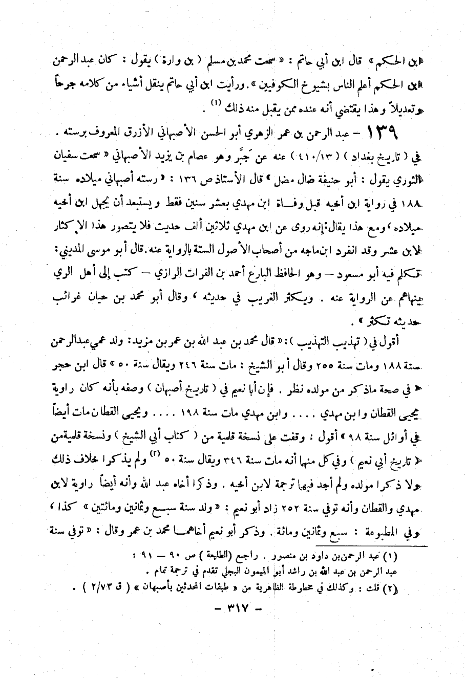 139- عبد الرحمن بن عمر الزهري أبو الحسن الأصبهاني الأزرق المعروف برسته . في ( تاريخ بغداد ) ( 13/410 ) عنه عن جبر وهو عصام بن يزيد الأصبهاني (( سمعت سفيان الثوري يقول : أبو حنيفة ضال مضل )) قال الأستاذ ص136 : (( رسته أصبهاني ميلاده سنة 188 في رواية ابن أخيه قبل وفاة ابن مهدي بعشر سنين فقط ويستبعد أن يجهل ابن أخيه ميلاده ، ومع هذا يقال : إنه روى عن ابن مهدي ثلاثين ألف حديث فلا يتصور هذا لإكثار لابن عشر وقد انفرد ابن ماجه من أصحب الأصول الستة بالرواية