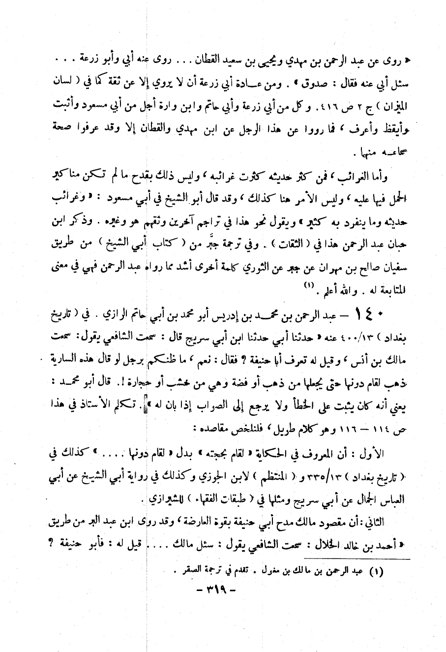 140- عبد الرحمن بن محمد بن إدريس أبو محمد بن أبي حاتم الرازي . في ( تاريخ بغداد ) 13/400 عنه (( حدثنا أبي حدثنا ابن أبي سريج قال : سمعت الشافعي يقول : سمعت مالك بن أنس ، وقيل له تعرف أبا حنيفة ؟ فقال : نعم ، ما ظنكم برجل لو قال هذه السارية ذهب لقام دونها حتى يجعلها من ذهب أوفضة وهي من خشب أو حجارة !. قال أبو محمد : يعني أنه كان يثبت على الخطأ ولا يرجع إلى الصواب إذا بان له )) تكلم الأستاذ في هذا ص 114 – 116 وهو كلام طويل ، فلنلخص مقاصده :