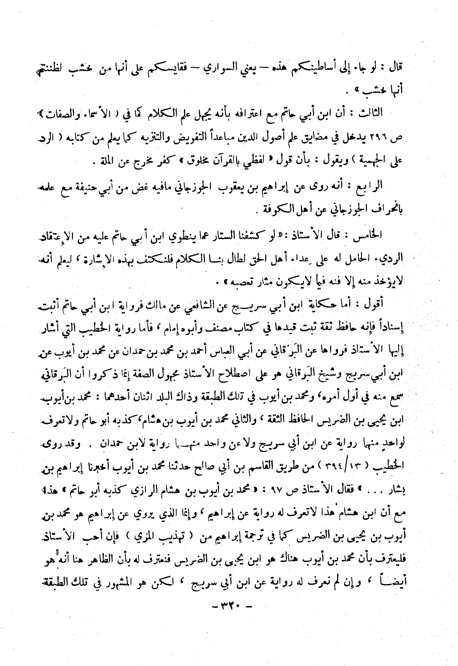 الثالث : أن ابن أبي حاتم مع اعترافه بأنه يجهل علم الكلام كما في ( الأسماء والصفات ) ص296 يدخل في مضايق علم أصول الدين مباعداً التفويض والتنزيه كما يعلم من كتابه ( الرد على الجهمية ) ويقول : بأن قول (( لفظي بالقرآن مخلوق )) كفر مخرج عن الملة .