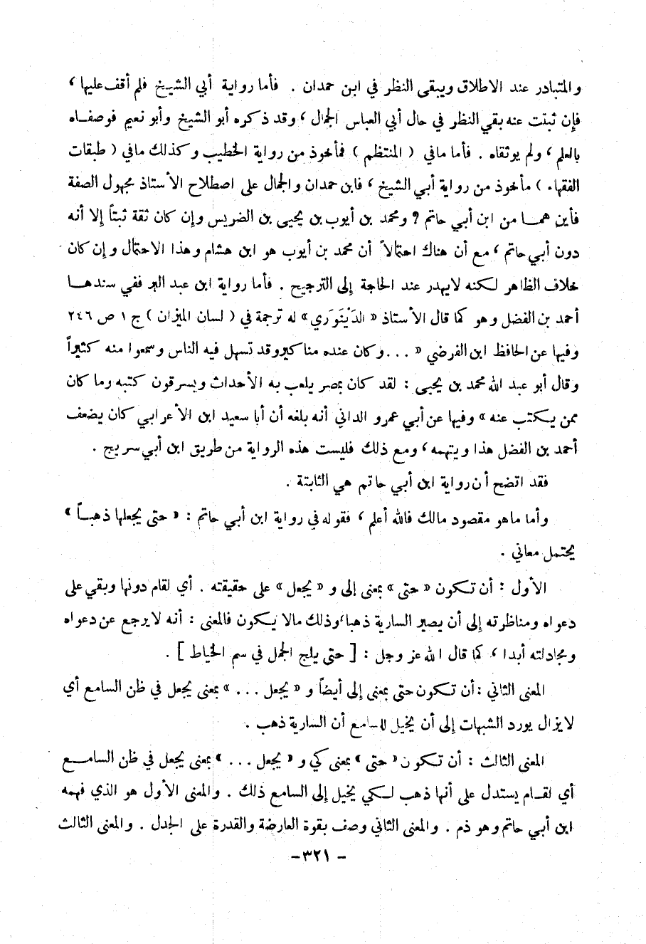 والمتبادر عند الإطلاق ويبقى النظر في ابن حمدان . فأما رواية أبي الشيخ فلم أقف عليها ، فإن ثبتت عنه بقي النظر في حال أبي العباس الجمال ،وقد ذكره أبو الشيخ وأبو نعيم فوصفاه بالعلم، ولم يوثقاه . فأما ما في ( المنتظم ) فمأخوذ من رواية الخطيب وكذلك ما في ( طبقات الفقهاء ) مأخوذ من رواية أبي الشيخ ، فابن حمدان والجمال على اصطلاح الأستاذ مجهول الصفة فأين هما من ابن أبي حاتم ؟ ومحمد بن أيوب بن يحيى الضريس وإن كان ثقة ثبتاً إلا أنه دون أبي حاتم ، مع أن هناك احتمالاً أن محمد بن أيوب هو ابن هشام وهذا الاحتمال وإن كان خلاف الظاهر لكنة لا يهدر عند الحاجة إلى الترجيح . فأما رواية ابن عبد البر ففي سندها أحمد بن الفضل وهو كما قال لأستاذ (( الدَيْنَوري )) له ترجمة في ( لسان الميزان ) ج1 ص246 وفيها عن الحافظ ابن الفرضي (( ... وكان عنده مناكير وقد تسهل فيه الناس وسمعوا منه كثيراً وقال أبو عبد الله محمد بن يحيى : لقد كان بمصر يلعب به الأحداث ويسرقون كتبه وما كان ممن يكتب عنه )) وفيها عن أبي عمرو الداني أنه بلغه أن أبا سعيد ابن الأعرابي كان يضعف أحمد بن الفضل هذا ويتهمه ومع ذلك فليست هذه الرواية من طريق ابن أبي سريج .