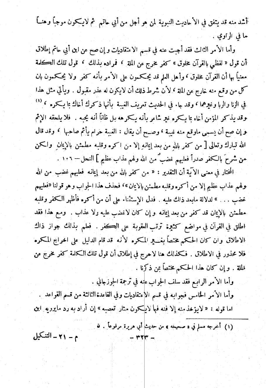 المختار من معنى الآية أن التقدير : (( من كفر بالله بعد إيمانه فعليهم غضب من الله ولهم عذاب عظيم إلا من أكره وقلبه مطمئن بالإيمان )) ، فحذف هذا الجواب وهو قولنا (( فعليهم غضب ... )) لدلالة ما بعد ذلك عليه . فدل الاستثناء على أن من أكره فأظهر الكفر وقلبه مطمئن بالإيمان فقد كفر من بعد إيمانه وإن كان لا غضب عليه ولا عذاب . ومع هذا فقد يكون أطلق في القرآن في مواضع كثيرة ترتب العقوبة على الكفر . فعلم بذلك جواز ذاك الإطلاق وإن كان الحكم مختصاً بغير المكره لأنه قد قام الدليل على إخراج المكروه فلا محذور في الإطلاق . فكذلك هنا لا حرج في إطلاق أن قول تلك الكلمة كفر مخرج عن الملة . وإن كان هذا الحكم مختصاً بمن ذكرنا .