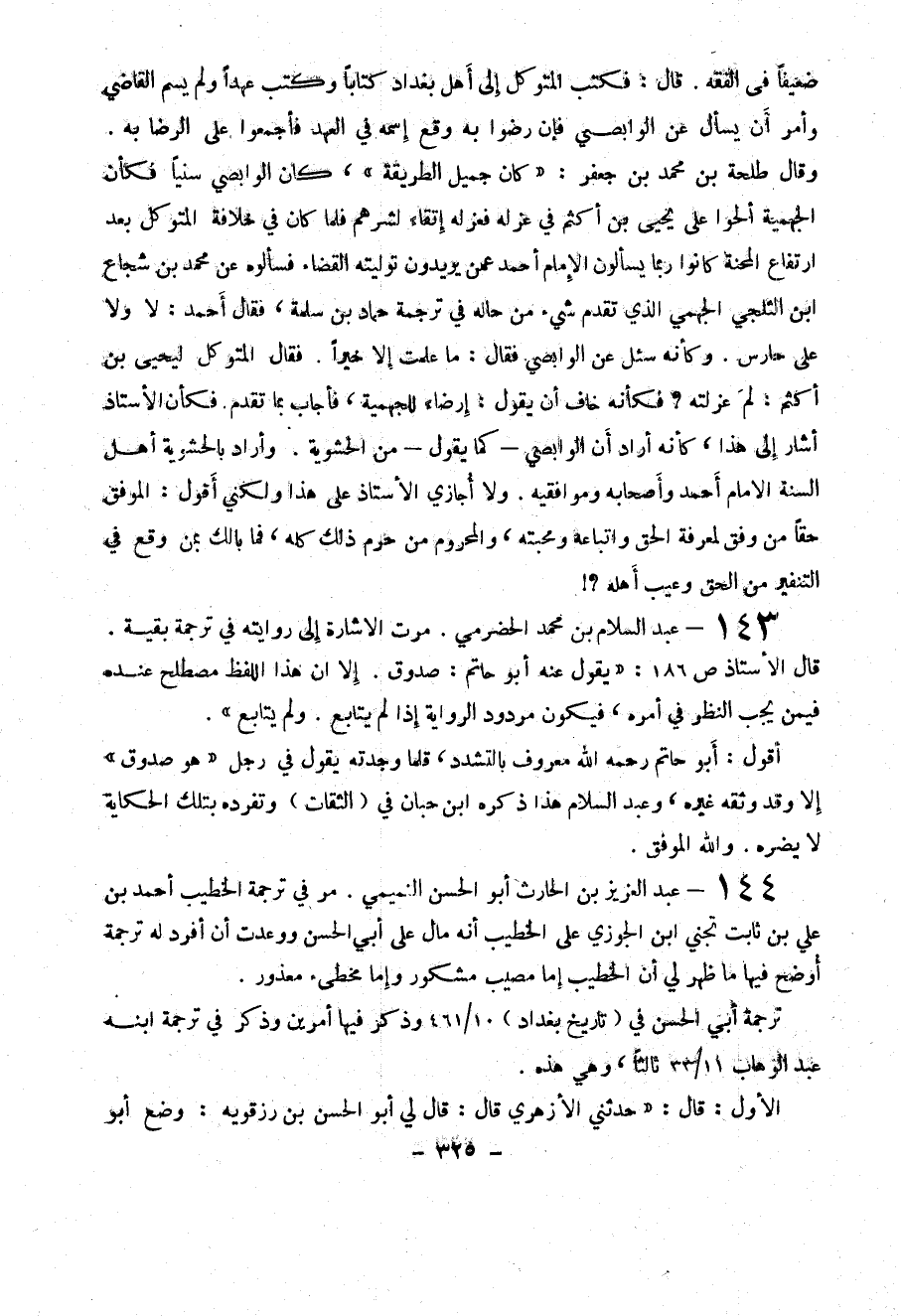 143- عبد اسلامبن محمد الحضرمي . مرت الإشارة إلى روايته في ترجمة بقية . قال الأستاذ ص186 : (( يقول عنه أبو حاتم : صدوق . إلا أن هذا اللفظ مصطلح عنده فيمن يجب النظر في أمره ، فيكون مردود الرواية إذا لم يتابع . ولم يتابع )) .