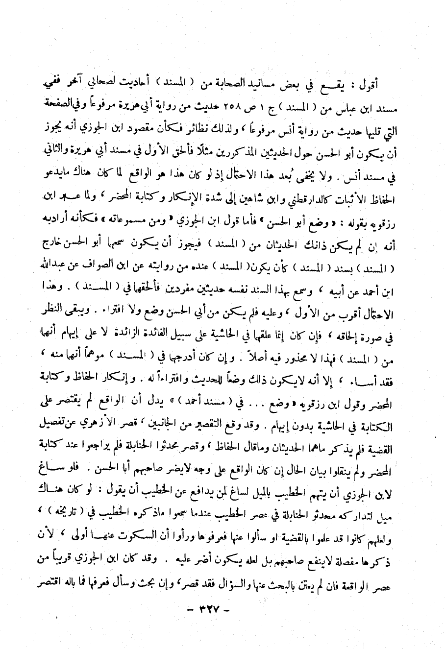 أقول : يقع في بعض مسانيد الصحابة من ( المسند ) أحاديث لصحابي آخر ففي مسند ابن عباس من ( المسند ) ج1 ص258 حديث من رواية أبي هريرة مرفوعاً وفي الصفحة التي تليها حديث من رواية أنس مرفوعاً ، ولذلك نظائر فكأن مقصود ابن الجوزي أنه يجوز أن يكون أبو الحسن حول الحديثين المذكورين مثلاً فألحق الأول في مسند أبي هريرة والثاني في مسند أنس . ولا يخفى بُعد هذا الاحتمال إذ لو كان هذا هو الواقع لما كان هناك ما يدعو الحفاظ الإثبات كالدارقطني وابن شاهين إلى شدة الإنكار وكتابه المحضر ، ولما عبر ابن رزقويه بقوله : (( وضع أبو الحسن )) فأما قول ابن الجوزي (( ومن مسموعاته )) فكأنها راد به أنه إن لم يكون ذانك الحديثان من ( المسند ) فيجوز أن يكون سمعها من أبو الحسن خارج ( المسند ) بسند ( المسند ) كأن يكون ( المسند ) عنده من روايته عن ابن الصواف عن عبد الله بن أحمد عن أبيه ، وسمع بهذا السند نفسه حديثين مفردين فألحقهما في ( المسند ) . وهذا الاحتمال أقرب من الأول ، وعليه فلم فلم يكن من أبي الحسن وضع ولا افتراء . ويبقى النظر في صورة إلحاقه ، فإن كان أنهما علقهما في الحاشية على سبيل الفائدة الزائدة لا على إيهام أنهما منه ، فقد أساء ، إلا أنه لا يكون ذلك وضعاً للحديث وافتراءً له . وإنكار الحفاظ وكتابة المحضر وقول ابن رزقويه((وضع ... في ( مسند أحمد ) )) يدل أن الواقع لم يقتصر على الكتابة في الحاشية بدون إيهام . وقد وقع التقصير من الجانبين ، قصر الأزهري عن تفصيل القضية فلم يذكر ما هما الحديثان وما قال الحفاظ ، وقصر محدثوا الحنابلة فلم يراجعوا عند كتابة المحضر ولم ينقلوا بيان الحال إن كان كان الواقع على وجه لا يضر صاحبهم أبا الحسن . فلو ساغ لابن الجوزي أن يتهم الخطيب بالميل لساغ لمن يدافع عن الخطيب أن يقول : لو كان هناك ميل لتداركه محدثو الحنابلة في عصر الخطيب عندما سمعوا ما ذكره الخطيب في ( تاريخه ) ، ولعلهم كانوا قد علموا بالقضية أو سألوا عنها فعرفوها ورأوا أن السكوت عنها أولى ، لأن ذكرها مفصلة لا ينفع صاحبهم بل لعله يكون أضر عليه . وقد كان ابن الجوزي قريباً من عصر الواقعة فإن لم يعتن بالبحث عنها والسؤال فقد قصر ، وإن بحث وسأل فعرفها فما باله اقتصر