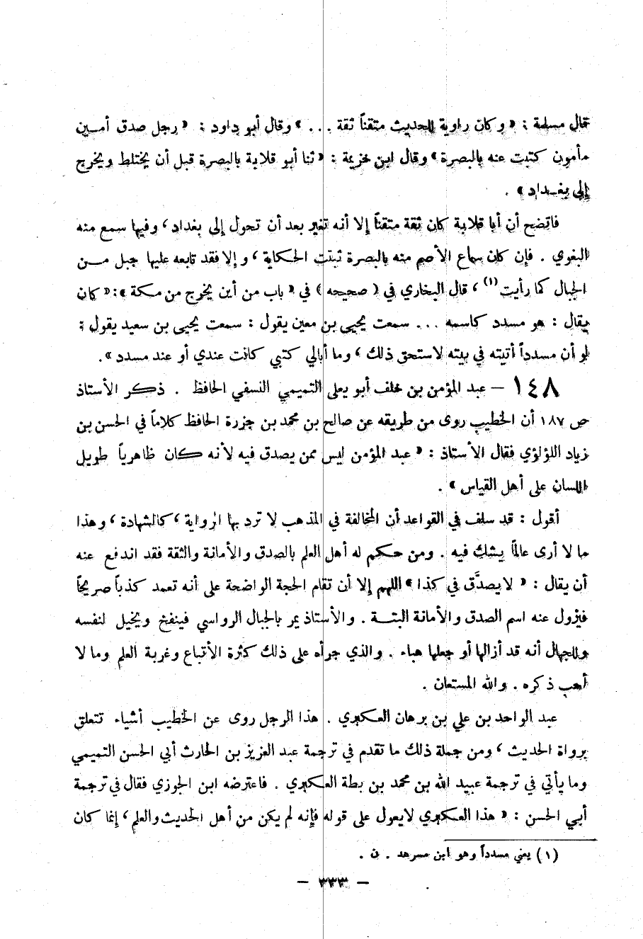 فاتضح أن أبا قلابة كان ثقة متقناً إلا أنه تغير بعد أن تحول إلى بغداد ، وفيها سمع منه البغوي . فإن كان الأصم منه بالبصرة ثبتت الحكاية ن ولآلا فقد تابعه عليها جبل من الجبال كما رأيت (1) قال البخاري في ( صحيحه ) في (( باب من اين يخرج من مكة )) : (( كان يقال ك هو مسدد كاسمه ... سمعت يحيى بن معين يقول ك سمعت يحيى بن سعيد يقول : لو أن مسدداً أتيته في بيته لاستحق ذلك ، وما أبالي كتبي كانت عندي أو عند مسدد )) .