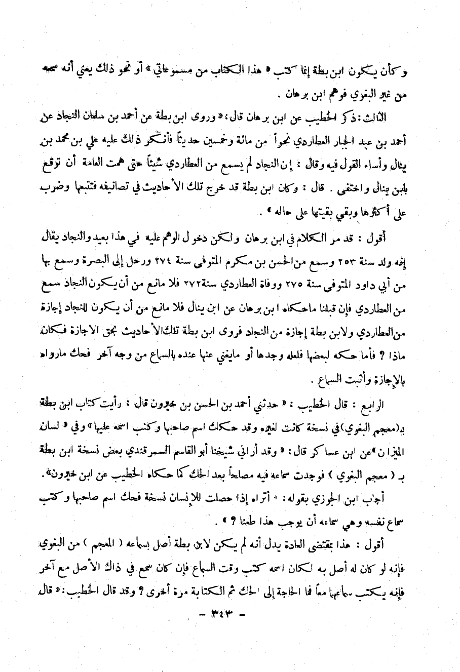 أقول : قد مر الكلام في ابن برهان ولكن دخول الوهم عليه في هذا بعيد والنجاد يقال إنه ولد سنة 253 وسمع من الحسن بن مكرم المتوفى سنة 274 ورحل إلى البصرة وسمع بها من أبي داود المتوفى سنة 275 ووفاة العطاردي سنة 272 فلا مانع من أن يكون النجاد قد سمع من العطاردي فإن قبلنا ما حكاه ابن برهان عن ابن ينال فلا مانع من أن يكون للنجاد إجازة من العطاردي ولابن بطة إجازة من النجاد فروى ابن بطة تلك الأحاديث بحق ألا جازة فكان ماذا ؟ فأما حكه لبعضها فلعله وجدها أو ما يغني عنها بالسماع من وجه آخر فحك ما رواه بالإجازة وأثبت السماع .