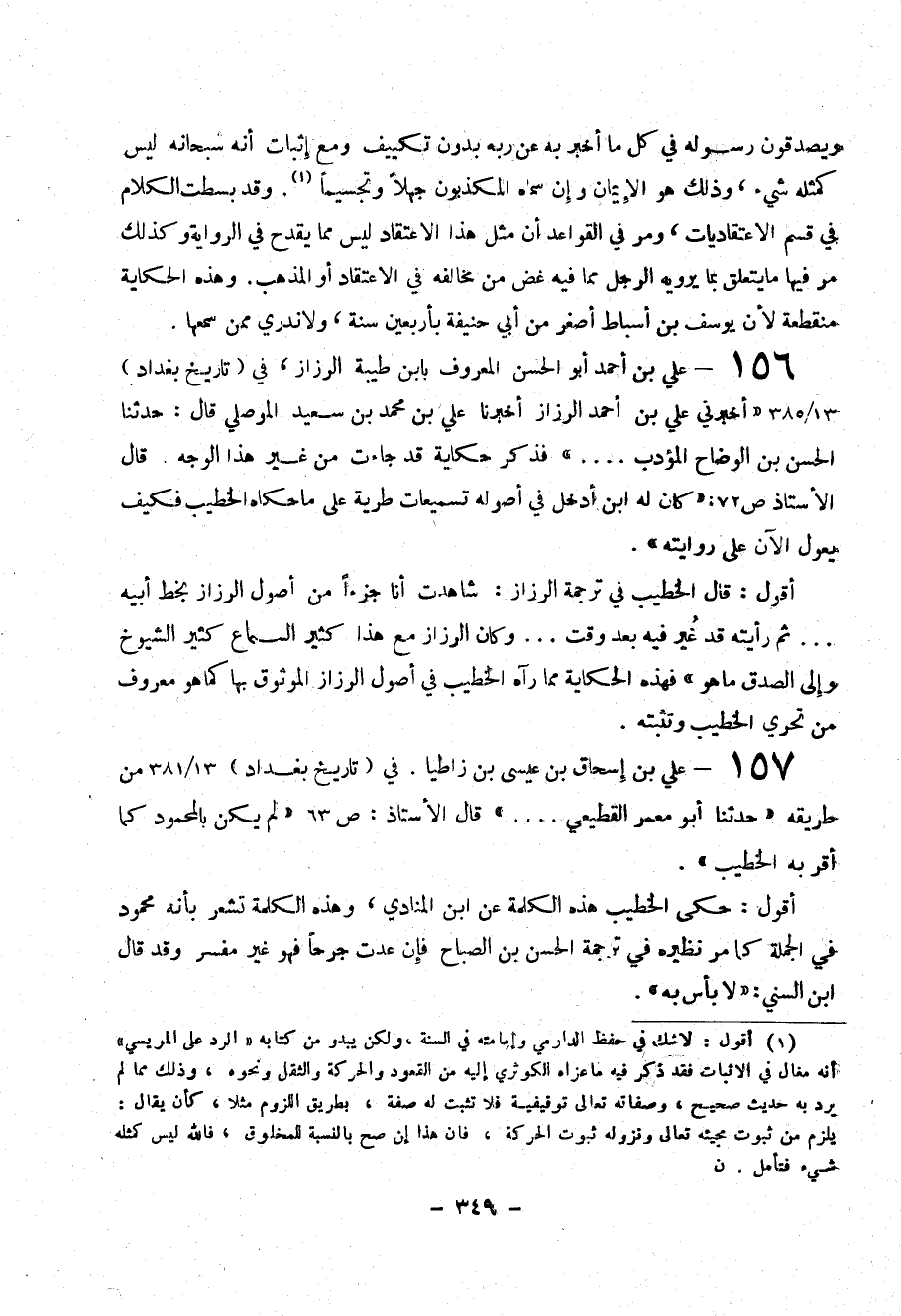 (1) أقول : لا شك في حفظ ألد ارمي وإمامته في السنة ، ولكن يبدو من كتابه (( الرد على المريسي )) أنه مغال في الإثبات فقد ذكر فيه ما عزاه الكوثري إليه من القعود والحركة والثقل ونحوه ، وذلك مما لم يرد به حديث صحيح ، وصفاته تعالى توقيفية فلا تثبت له صفة ، بطريق اللزوم مثلا ، كأن يقال : يلزم من ثبوت مجيئه تعالى ونزوله ثبوت الحركة ، فان هذا إن صح بالنسبة للمخلوق ، فالله ليس كمثله شيء فتأمل . ن