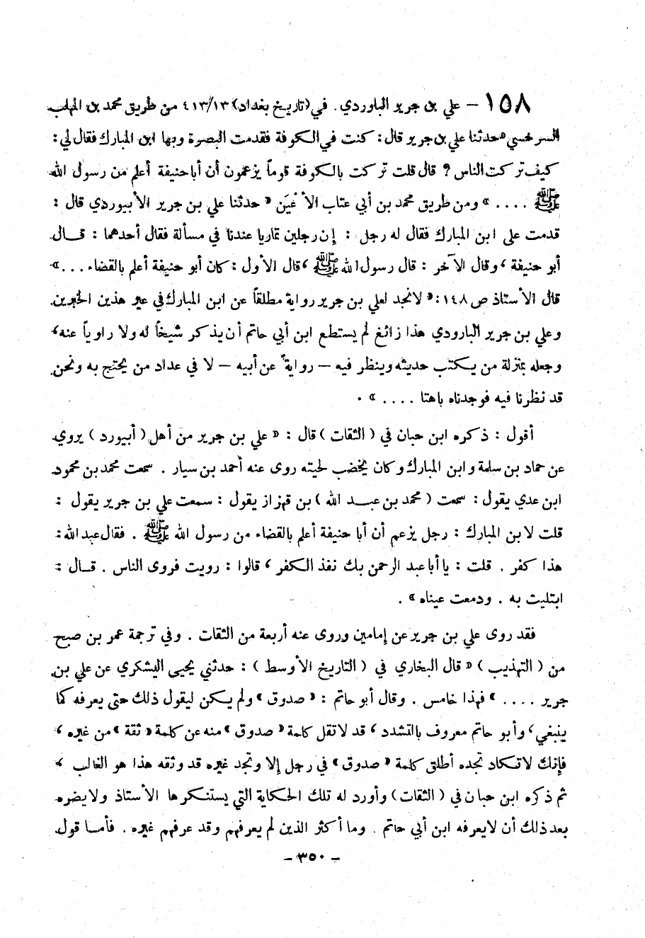 158- علي بن جرير الباوردي . . في ( تاريخ بغداد ) 13 / 413 من طريق محمد بن المهلب الرخسي (( حدثنا علي بن جرير قال : كنت في الكوفة فقدمت البصرة وبها ابن المبارك فقال لي : كيف تركت الناس ؟ قال قلت تركت بالكوفة قوماً يزعمون أن أبا حنيفة أعلم من رسول الله صلى الله عليه وسلم .... )) ومن طريق محمد بن أبي عتاب الأعين (( حدثنا علي بن جرير الأبيوردي قال : قدمت على ابن المبارك فقال له رجل : إن رجلين تماريا عندنا في مسألة فقال أحدهما : قال أبو حنيفة ، وقال الآخر : قال رسول الله صلى الله عليه وسلم ، قال الأول : كان أبو حنيفة أعلم بالقضاء ... )) قال الأستاذ ص 148 : (( لا نجد لعلي بن جرير رواية مطلقاً عن ابن المبارك في عير هذين الخبرين وعلي بن جرير البار ودي هذا زائغ لم يستطيع ابن حاتم أن يذكر شيخاً له ولا راوياً عنه ، وجعله بمنزلة من يكتب حديثه وينظر فيه - رواية عن أبيه - لا في عداد من يحتج به ونحن قد نظرنا فيه فوجدنا باهتا .... )) .