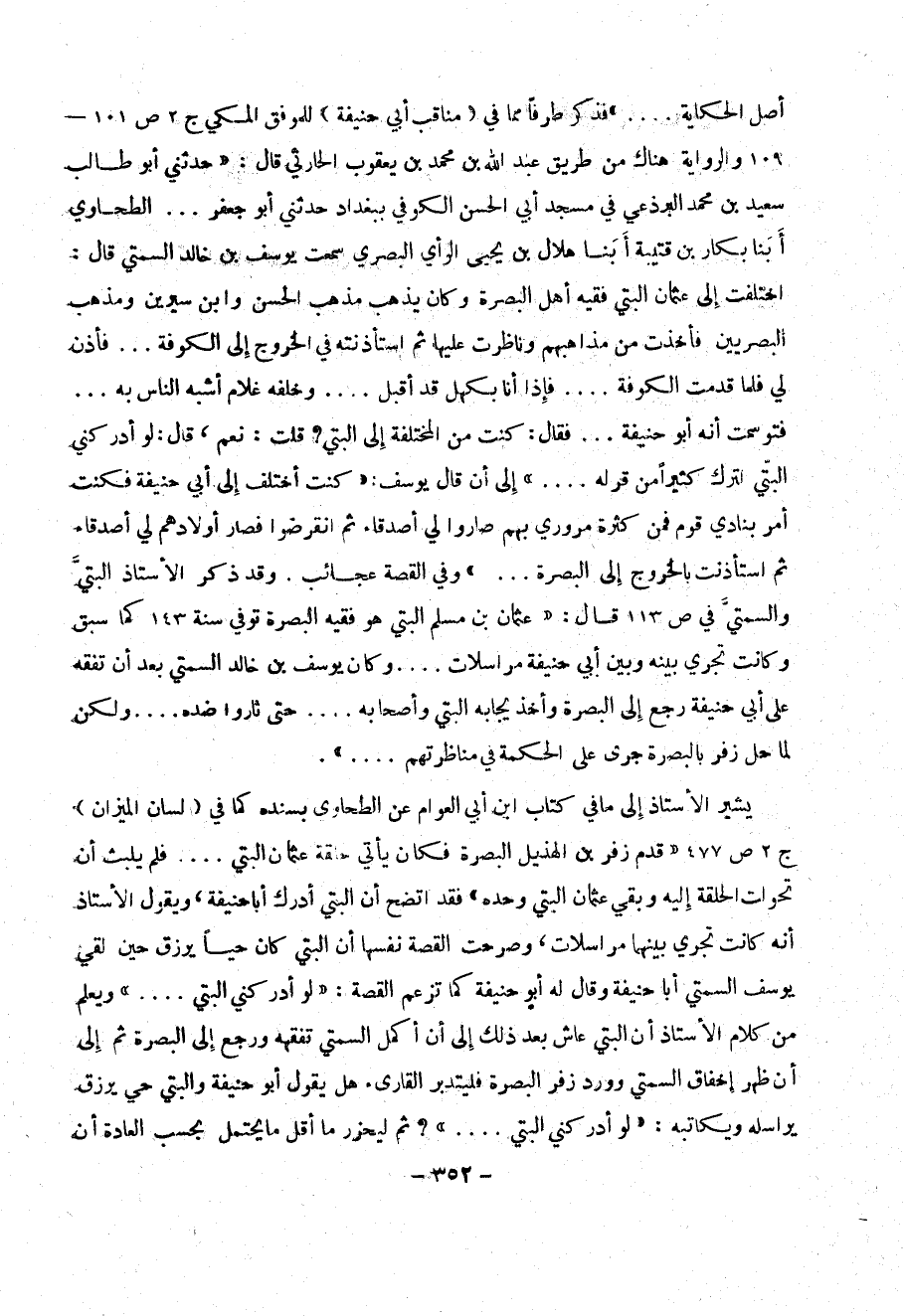 أصل الحكاية .... )) فذكر طرفاً مما في ( مناقب آبى حنيفة ) للموفق المكي ج 2 ص 101 - - 109 والرواية هناك من طريق عبد الله بن محمد بن يعقوب الحارثي قال : (( حدثني أبو طالب سعيد بن محمد البرذعي بن قتيبة أبنا هلال بن يحيى الرأي البصري سمعت يوسف بن خالد السمتي قال : اختلفت إلى عثمان البتي فقيه أهل البصرة وكان يذهب مذهب الحسن وابن سيرين ومذهب البصريين فأخذت من مذاهبهم وناظرت عليها ثم استأذنته في الخروج إلى الكوفة ... فأذن لي فلما قدمت الموفية .... فإذا أنا بكهل قد أقبل .... وخلفه غلام أشبه الناس به ... فتوسمت أنه أبو حنيفة ... فقال : كنت من المختلفة إلى البتي ؟ قلت : نعم ، قال : لو أدركني البتي لترك كثيراً من قوله .... )) إلى أن قال يوسف : (( كنت أختلف إلى ابي حنيفة فكنت أمر بنادي قوم فمن كثرة مروري بهم صاروا لي أصدقاء ثم انقرضوا فصار أولادهم لي أصدقاء ثم استأذنت بالخروج إلى البصرة ... )) وفي القصة عجائب . وقد ذكر الأستاذ البتي والسمتي في ص 113 قال : (( عثمان بن مسلم البتي هو فقيه البصرة توفي سنة 143 كما سبق وكانت تجري بينه وبين آبي حنيفة مراسلات .... وكان يوسف بن خالد السمتي بعد أن تفقه على أبي حنيفة رجع إلى البصرة وأخذ يجابه البتي وأصحابه .... حتى ثاروا ضده .... ولكن لما حل زفر بالبصرة جرى على الحكمة في مناظرتهم .... )) .