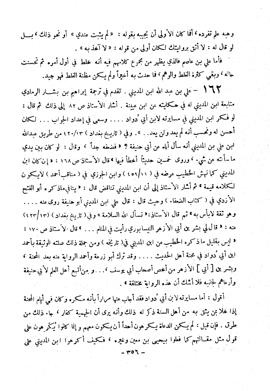 162- علي بن عبد الله بن المديني . تقدم في ترجمة إبراهيم بن بشار الرمادي متابعة ابن المديني له في حكايته عن ابن عيينة . أشار الأستاذ ص 82 إلى ذلك ثم قال : (( لو فكر ابن المديني في مسايرته لابن أبي داود ... وسعى في إعداد الجواب ... لكان أحسن له ونحسن أنه لم يعد ولن يعد ... )) . وفي ( تاريخ بغداد ) 13/420 من طريق عبد الله بن علي بن المديني أنه سأل أباه عن أبي حنيفة ؟ (( فضعفه جداً ، وقال : لو كان بين يدي ما سألته عن شيء ، وروى خمسين حديثاً أخطأ فيها )) قال الأستاذ ص 168 : (( إن كان ابن المديني كما نهش الخطيب عرضه في ( 11/459 ) وابن الجوزي في ( مناقب أحمد ) لا يكون لكلامه قيمة )) ثم أشار الأستاذ إلى أن ابن المديني تناقض قال : (( ينافي ما ذكره أبو الفتح الأزدي في ( كتاب الضعفاء ) وحيث قال : قال علي ابن المديني أبو حنيفة روى عنه ... وهو ثقة لا بأس به )) ثم قال الأستاذ : (( نسأل الله السلامة )) وفي ( تاريخ بغداد ) ( 13/423 ) عنه : (( قال لي بشر بن أبي الأزهر النيسابوري رأيت في المنام ... )) قال الأستاذ ص 170 : (( ليس بقليل ما ذكره الخطيب عن ابن المديني في ( تاريخه ) ومن جملة ذلك صلته الوثيقة بأحمد ابن أبي داود في محنة أهل الحديث ... وقد ترك أبو زرعة وأحمد الرواية عنه بعد المحنة وبشر بن [ أبي ] الأزهر من أخص أصحاب أبي يوسف ، ... ومن أتبع أهل العلم لأبي حنيفة وأرعاهم لجانبه فلا أشك أن هذه الرواية مختلقة )) .
