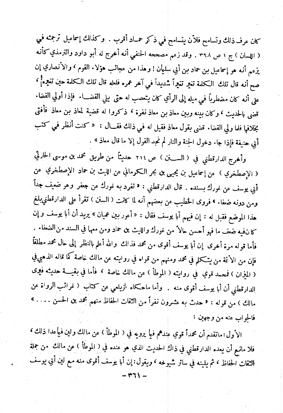 الأول : ما تقدم أن محمد قوي عندهم فيما يرويه في ( الموطأ ) عن مالك ولين فيما عدى ذلك ، فلا مانع أن يعده الدارقطني في ذاك الحديث الذي هو عنده في ( الموطأ ) عن مالك من جملة الثقات الحفاظ ، ثم يلينه في سائر شيوخه ، ويقول : إن أبا يوسف أقوى منه مع لين أبي يوسف