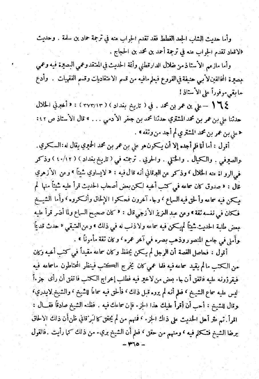164- على بن عمر بن محمد . في ( تاريخ بغداد ) (13/373) : (( أخبرني الخلال حدثنا على بن عمر بن محمد المشتري حدثنا محمد بن جعفر الأدمي ... )) قال الأستاذ ص 42 : (( علي بن عمر بن محمد المشتري لم أجد من وثقه )) .