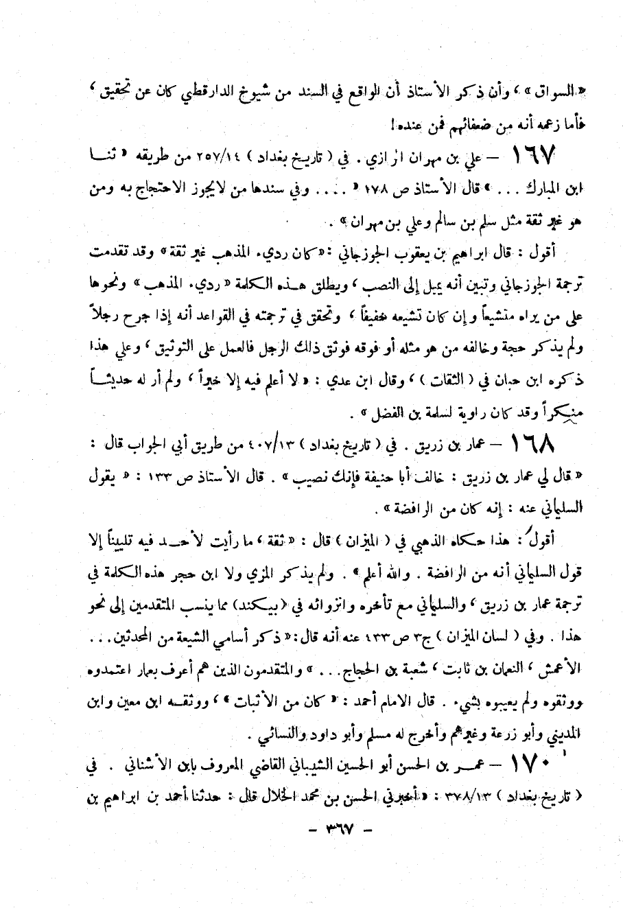 168- عمار بن زريق . في ( تاريخ بغداد ) 13/407 من طريق أبي الجواب قال : (( قال لي عمار بن زريق : خالف أبا حنيفة فإنك نصيب )) . قال الأستاذ ص 133 : (( يقول السليماني عنه : إنه كان من الرافضة )) .