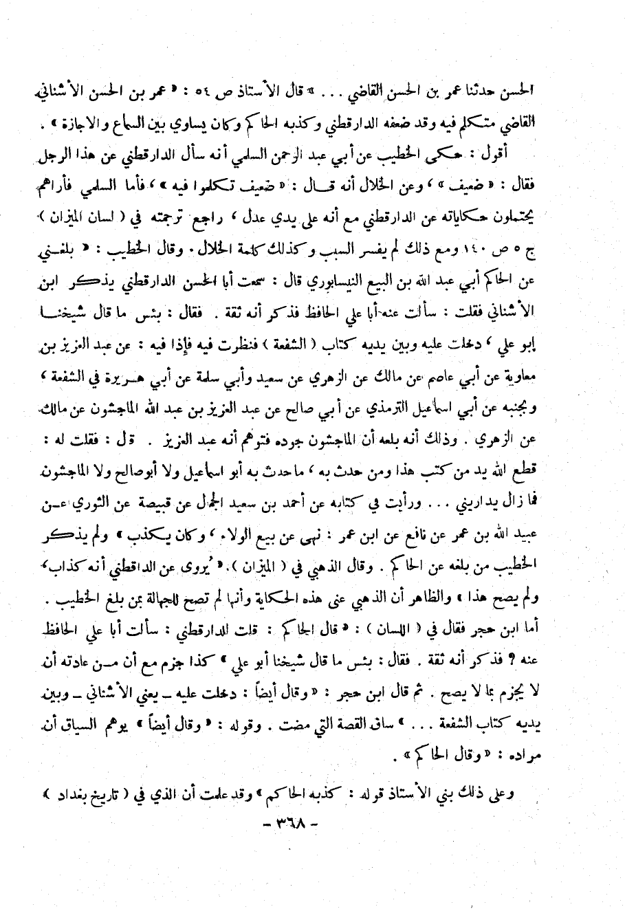 الحسن حدثنا عمر بن الحسن القاضي ... )) قال الأستاذ ص 54: (( عمر بن الحسن الأشناني القاضي متكلم فيه وقد ضعفه الدارقطني وكذبه الحاكم وكان يساوي بين السماع الاجازة )) .