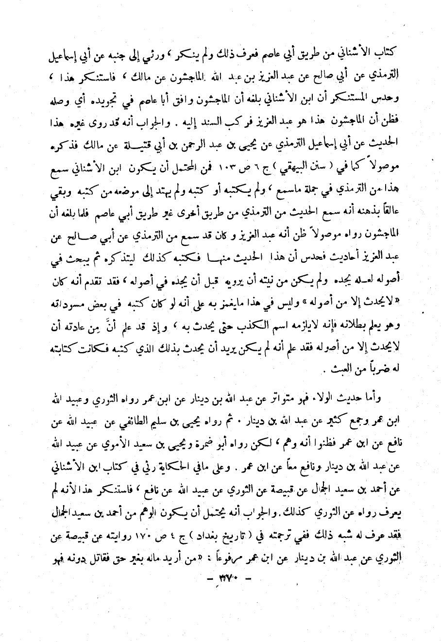 وأما حديث الولاء فهو متواتر عن عبد الله بن دينار عن ابن عمر رواه الثوري وعبد الله بن عمر وجمع كثير من عبد الله بن دينار . ثم رواه يحيى بن سليم الطائفي عن عبيد الله عن نافع عن ابن عمر فظنوا أنه وهم ، لكن رواه أبو ضمرة ويحيى بن سعيد الأموي عن عبيد الله عن عبد الله بن دينار ونافع معاً عن ابن عمر وعلى ما في الحكاية رئي في كتاب ابن الأشناني عن أحمد بن سعيد الجمال عن قبيصة عن الثوري عن عبيد الله عن نافع ، فاستنكر هذا لأنه لم يعرف رواه عن الثوري كذلك . والجواب أنه يحتمل أن يكون الوهم من أحمد بن سعيد الجمال فقد عرف له شبيه ذلك ففي ترجمته في ( تاريخ بغداد ) ج 4ص 170 عن قبيصة عن الثوري عن عبد الله بن دينا عن ابن عمر مرفوعاً : (( من أريد ماله بغير حق فقاتل دونه فهو