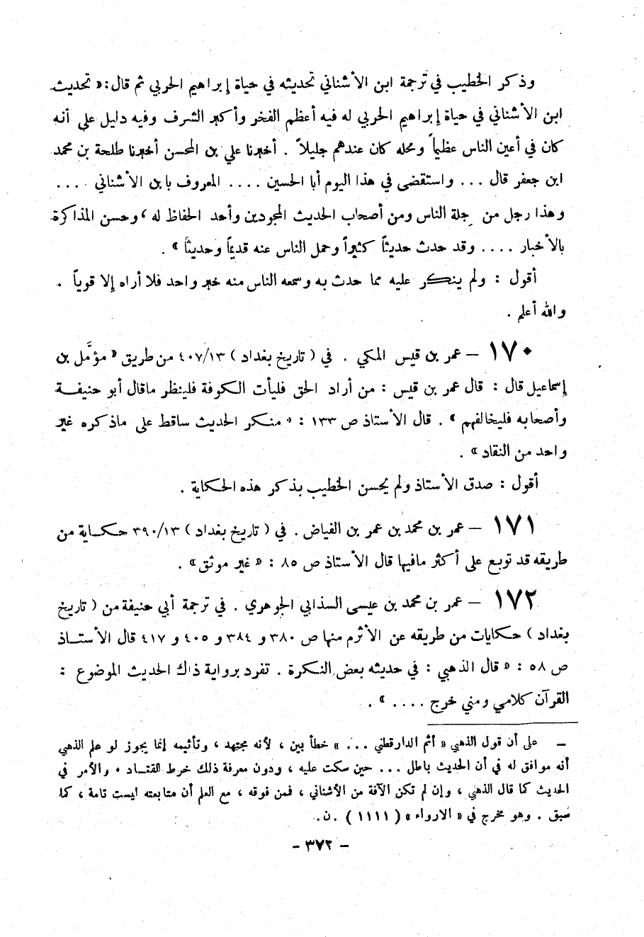 170- عمر بن قيس المكي . في ( تاريخ بغداد ) 13/407 من طريق مؤمل بن إسماعيل قال : قال عمرو بن قيس : من أراد الحق فليأت الكوفة فلينظر ما قال أبو حنيفة وأصحابه فليخالفهم )) . قال الأستاذ ص 133 : (( منكر الحديث ساقط على ما ذكره غير واحد من النقاد )) .