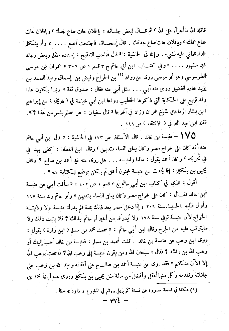 175 ـ عنبسة بن خالد . قال الأستاذ ص 173 في الحاشية : (( قال ابن أبي حاتم عنه أنه كان على خراج مصر وكان يعلق النساء بثديهن ، وقال ابن القطان : كفى بهذا في تجريحه ، وكان أحمد يقول : مالنا ولعنبسة ... هل روى عنه غير أحمد بن صالح ؟ وقال يحيى بن بكير : إنما يحدث عن عنبسة مجنون أحمق لم يكن بموضع للكتابة عنه )) .