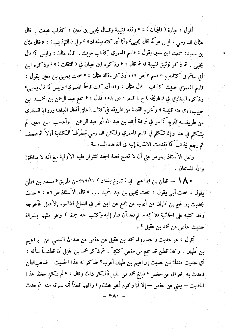 180- قطن بن إبراهيم . في ( تاريخ بغداد ) 13 / 379 من طريق (( مسدد بن قطن يقول : سمعت أبي يقول : سمعت يحيى بن عبد الحميد ... )) قال الأستاذ ص 56 : (( حدث بحديث إبراهيم بن طهان عن أيوب عن نافع عن ابن عمر في الدباغ فطالبوه بالأصل فأخرجه وقد كتبه على الحاشية فتركه مسلم بعد أن صار إليه وكتب عنه جملة وهو متهم بسرقة حديث حفص عن محمد بن عقيل )) .