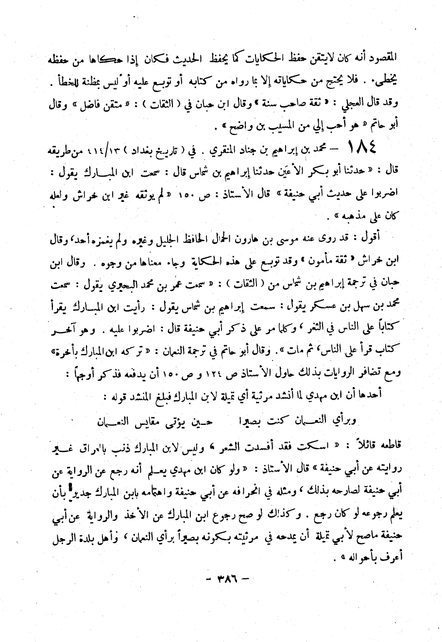 قاطعة قائلا : (( أسكت فقد أفسدت الشعر وليس لأبن المبارك ذنب بالعراق غير روايته عن أبي حنيفة )) قال الأستاذ : (( ولو كان ابن مهدي يعلم أنه رجع عن الرواية عن أبي حنيفة لصارحه بذلك ومثله في انحرافه عن أبي حنيفة واهتمامه بابن المبارك جدير بأن يعلم رجوعه لو كان رجع .