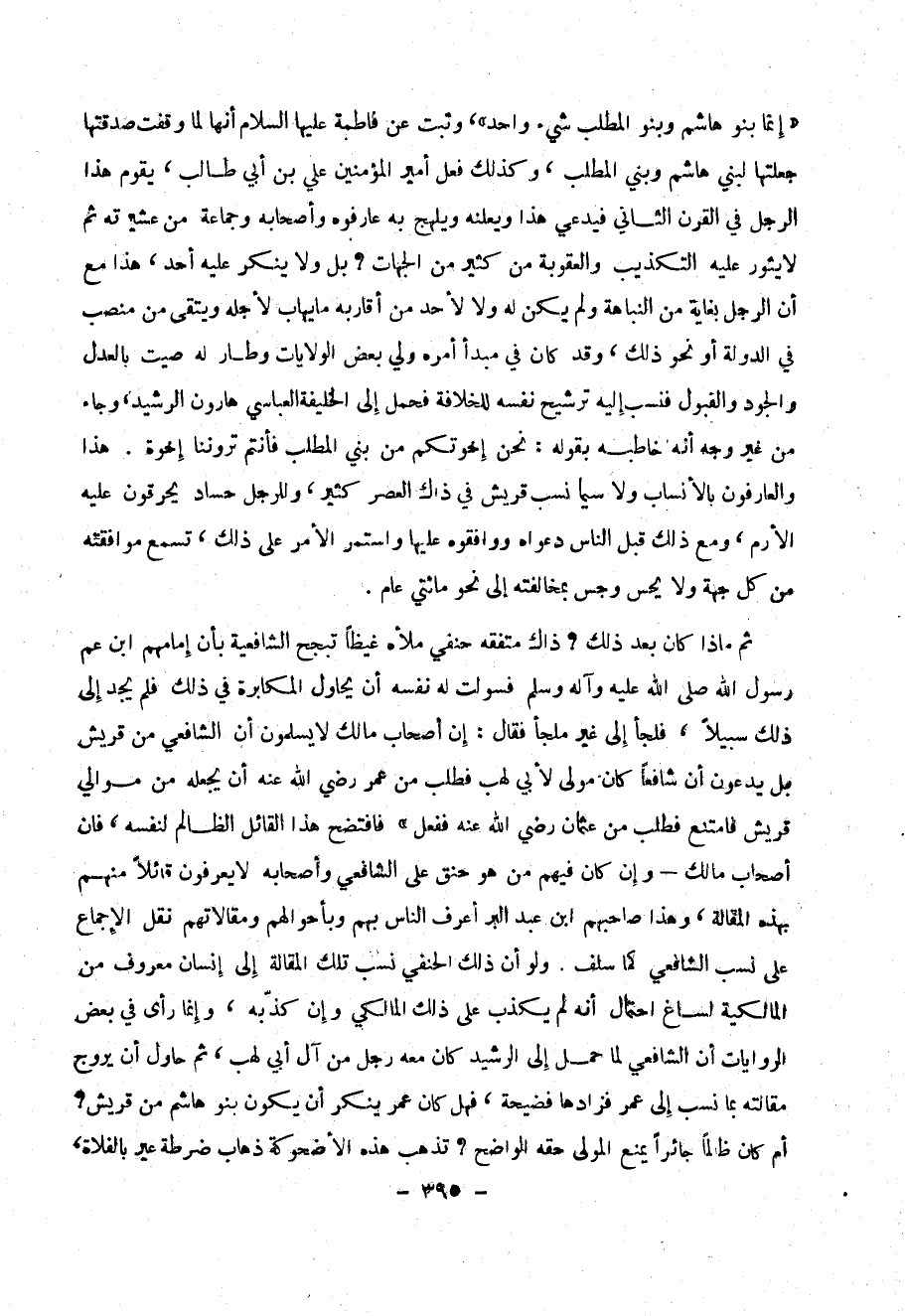 ولو أن ذلك الحنفي نسب تلك المقالة إلى إنسان معروف من المالكية لساغ احتمال أنه لم يكذب على ذلك المالكي وأن كذبه وإنما رأى في بعض الروايات أن الشافعي لما حمل إلى الرشيد كان معه رجل من آل أبي لهب ثم حاول أن يروج مقالته بما نسب إلى عمر فزادها فضيحة فهل كان عمر ينكر أن يكون بنو هاشم من قريش ؟ أم كان ظالما جائرا يمنع المولى حقه الواضح ؟