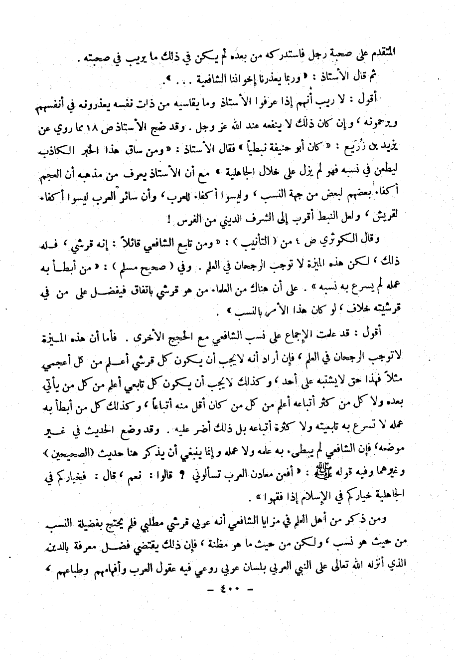 أقول " لا ريب أنهم إذا عرفوا الأستاذ وما يقاسيه من ذات نفسه يعذرونه في أنفسهم ويرجمونه ، وإن كان ذلك لا ينفعه عند الله عز وجل . وقد ضج الأستاذ ص 18 مما روي عن يزيد بن زريع : (( كان أبو حنيفة نبطيا" )) فقال الأستاذ : (( ومن ساق هذا الخبر الكاذب ليطعن في نسبة فهو لم يزل على خلال الجاهلية )) من أن الأستاذ يعرف من مذهبه أن العجم أكفاء بعضهم لبعض من جهة النسب ، وليسوا أكفاء للعرب ، وأن سائر العرب ليسوا أكفاء لقريش ، ولعل النبط أقرب إلى الشرف الديني من الفرس !
