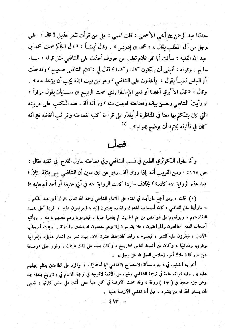 حدثنا عبد الرحمن بن أخي الأصمعي : قلت لعمي : على من قرأت شعر هذيل ؟ قال : على رجل من آل المطلب يقال له : محمد بن إدريس )) – وقال أيضا" : (( قال الحاكم سمعت محمد بن عبد الله الفقيه : سألت آبا عمر غلام ثعلب عن حروف أخذت على الشافعي مثل قوله : ماء مالح . وقوله / أنبغي أن يكون كذا وكذا ، فقال لي : كلام الشافعي صحيح ن وقد سمعت آبا العباس ثعلبا" يقول : يأخذون على الشافعي ، وهو من بيت اللغة يجب أن يؤخذ عنه )) .