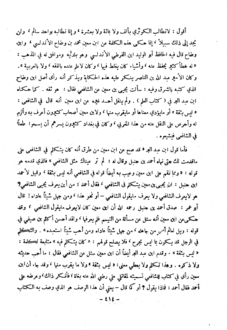وكان الأمير عبد الله بن الناصر ينكر عليه هذه الحكاية ويذكر انه رأى اصل ابن وضاح الذي كتبه بالشرق وفيه : سألت يحيى بن معين عن الشافعي فقال : هو ثقة . كما حكاه أبن عبد البر في ( كتاب العلم ) . ولم ينقل أحد غيره عن ابن معين أنه قال في الشافعي : (( ليس بثقة )) أو ما يؤدي معناها أو ما يقرب منها ، ولابن معين أصحاب كثيرون اعرف به وألزم له وأحرص على النقل عنه من هذا المغربي ، وكان في بغداد كثيرون يسرهم آن يسمعوا طعنا في الشافعي فيشيعوه .
