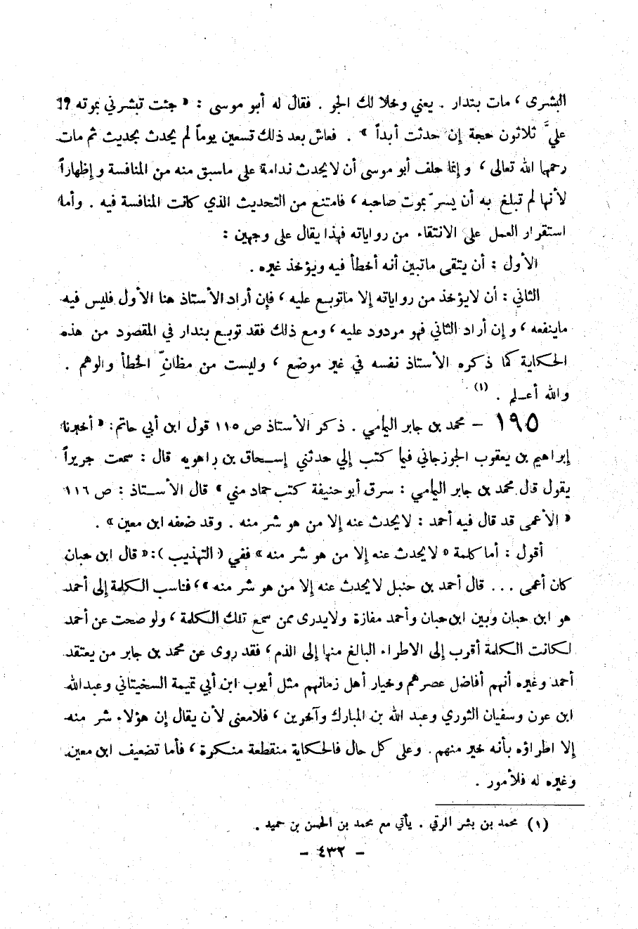 البشري، مات بندار. يعني وخلا لك الجو. فقال له أبو موسى ك ((جئت تبشرني بموته؟! علي ثلاثون حجة إن حدثت أبدا)). فعاش بعد ذلك تسعين يوما" لم يحدث ثم مات رحمهما الله تعالى، وإنما حلف أبو موسى أن لا يحدث على ما سبق منه من المنافسة وإظهارا" لأنها لم تبلغ به ان يسر بموت صاحبه ن فامتنع من الحديث الذي كانت المنافسة فيه. وأما استقرار العمل على الانتقاء من رواياته فهذا يقال على وجهين: