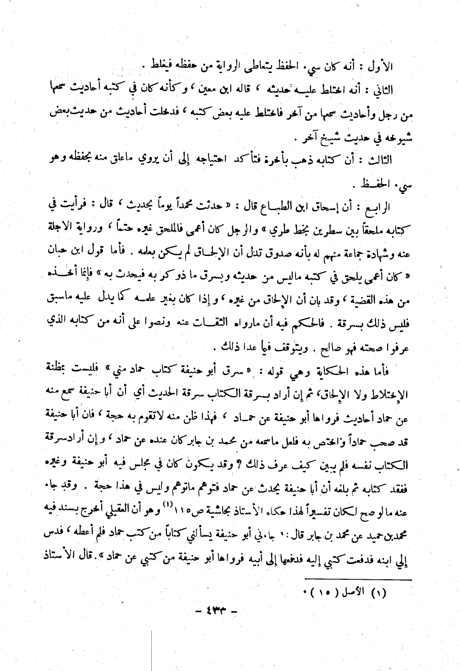 لآلما هذه الحكاية وهي قوله: ((سرق أبو حنيفة كتاب حماد مني)) فليست بمظنة الإختلاط ولا الإلحاق، ثم إن أراد بسرقة الكتاب سرقة الحديث أي أبا حنيفة سمع منه عن حماد أحاديث فرواها أبو حنيفة عن حماد، فهذا ظن منه لا تقوم به حجة ن فان آبا حنيفة قد صحب حمادا" واختص به فلعل ما سمعه من محمد بن جابر كان عنده عن حماد، وإن أراد سرقة الكتاب نفسه فلم يبين كيف عرف ذلك؟ وقد يكون كان في مجلس فيه أبو حنيفة وغيره ففقد كتابه ثم بلغه أن أبا حنيفة يحدث عن حماد فتوهم ما توهم وليس في هذا حجة. وقد جاء عنه ما لو صح لكان تفسيرا" لهذا حكاه الأستاذ بحاشية ص 115 (1) وهو أن العقيلي أخرج بسند فيه محمد بن حميد عن محمد بن جابر قال ك جائني أبو حنيفة من كتبي عن حماد فلم أعطه، فدس إلي ابنه فدفعت كتبي إليه فدفعها إلى أبيه فرواها أبو حنيفة من كتبي عن حماد)) قال الأستاذ