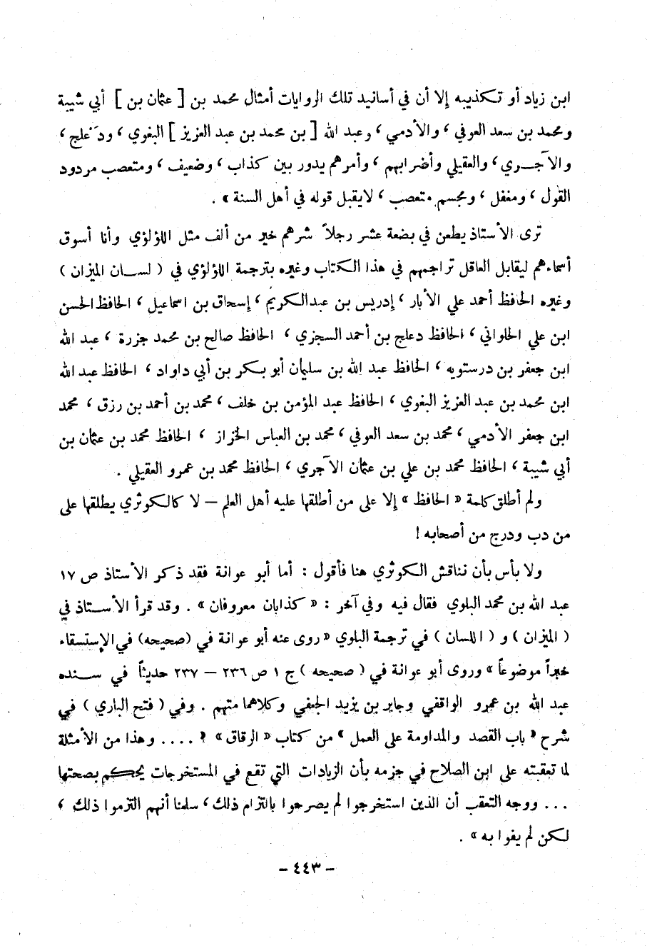 ولا بأس بأن نناقش الكوثري هنا فأقول : أما أبو عوانة فقد ذكر الأستاذ ص 17 عبد الله بن محمد البلوي فقال فيه وفي آخر : (( كذابان معروفان )) . وقد قرأ الأستاذ في (الميزان) و(( اللسان )) في ترجمة البلوي (( روى عنه أبو عوانة في ( صحيحه ) في الإستسقاء خبرا" موضوعا" )) وروى أبو عوانة في ( صحيحه ) ج 1 ص 236 – 237 حديثا" في سنده عبد الله بن عمرو الواقفي وجابر بن يزيد الجعفي وكلاهما متهم . وفي ( فتح الباري ) في شرح (( باب القصد والمدارمة على العمل )) من متاب (( الرقاق )) (( .... وهذا من الأمثلة لما تعقبه على ابن الصلاح في جزمه بأن الزيادات التي تقع في المستخرجات يحكم بصحتها ... ووجه التعقب أن الذين استخرجوا لم يصرحوا بالالتزام ذلك ، سلمنا أنهم التزموا ذلك ، لكن لن يفوا به )) .