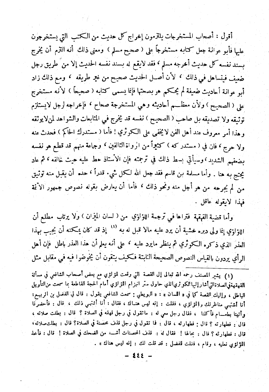 وأما قضية القهقهة فتراها في ترجمته اللؤلؤي من (( لسان الميزان )) ولا يرتاب مطلع أن اللؤلؤي إنما ولي دبره خشية أن يريد عليه ما لا قبل له به (1) إذ قد كان يمكنه آن يجيب بهذا الذر الذي ذكره الكوثري ثم ينظر ما يرد عليه ، على أنه يعلم أن هذا العذر باطل فإن أهل الرأي يردون بالقياس النصوص الصحيحة الثابتة فكيف يتقون أن يخوضوا فيه في مقابل مثل