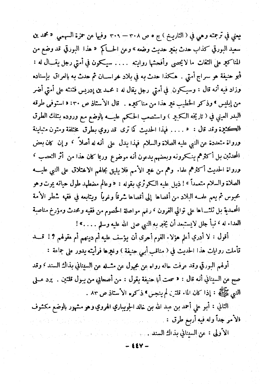 يعني في ترجمة وهي في ( التاريخ ) ج 5 ص 308 – 309 وفيها عن حمزة السهمي (( محمد بن سعيد البورقي كذاب حدث بغير حديث وضعه )) وعن الحاكم (( هذا البورقي قد وضع من المناكير على الثقات ما لا يحصى وأفحشها روايته .... سيكون في أمتي رجل يقال له : أبو حنيفة هو سراج أمتي . هكذا حدث به في بلاد خرسان ثم حدث به بالعراق بإسناده وزاد فيه انه قال : سيكون في أمتي رجل يقال له ك محمد بن إدريس فتنته على أمتي اضر من إبليس )) وذكر الخطيب غير هذا من مناكيره . قال الأستاذ ص 30 : (( استوفى طرقه البدر العيني في ( تاريخه الكبير ) واستصعب الحكم عليه بالوضع مع وروده بتلك الطرق الكثيرة وقد قال : (( .... فهذا الحديث كما ترى قد روى بطرق مختلفة ومتون متبتينة ورواه متعددة عن النبي عليه الصلاة والسلام فهخذا يدل على أنه له أصلا" ، وإن كان بعض المحدثين بل أكثرهم ينكرونه وبعضهم يدعون أنه موضوع وربما كان هذا من اثر التعصب ، ورواة الحديث أكثرهم علماء وهم من خير الأمم فلا يليق بحالهم الاختلاق على النبي عليه الصلاة والسلام متعمدا" )) ! ذيل عليه الكوثري بقوله : (( وعالم مضطهد طول حياته يموت وهو محبوس ثم يعم علمه البلاد من أقصاها إلى أقصاها شرقا" وغربا" ويتابعه في فقهه شطر الأمة المحمدية بل ثلثلها على توالي القرون ، رغم موأصلة الخصوم من فقيه ومحدث ومؤرخ مناصبه العداء له ، نبا جلل لا يستعد أن يخبر به النبي صلى الله عليه وسلم .... )) !