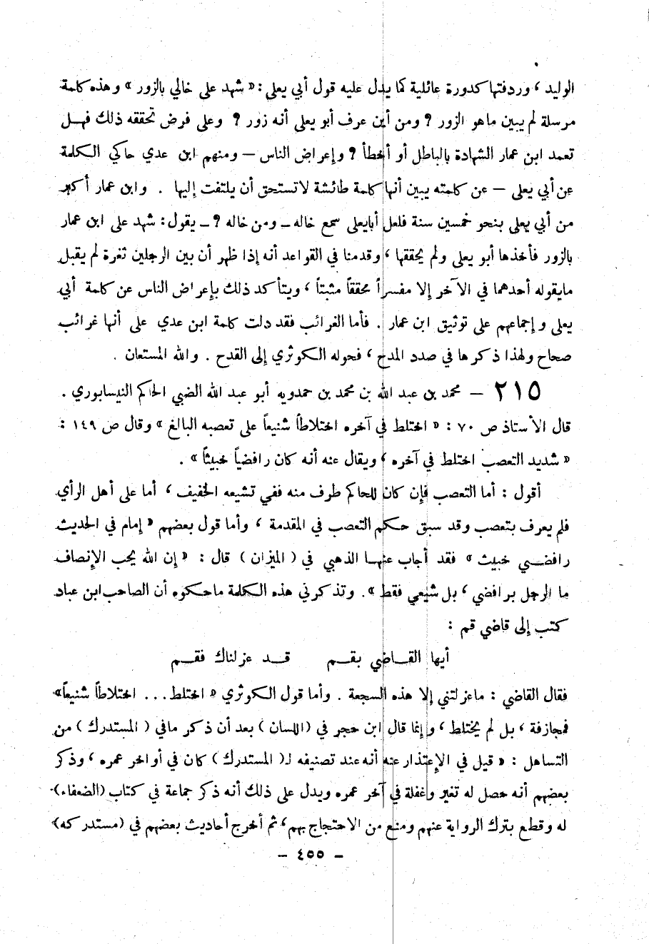 فقال القاضي : ما عزلتني إلا هذه السجعة – وأما قول الكوثري (( اختلط ... أختلاطا" شنيعا" فمجازفة ، بل لم يختلط ، وإنما قال ابن حجر في ( اللسان ) بعد أن ذكر ما في ( المستدرك ) من التساهل : (( قيل في الاعتذار عنه أنه عند تصنيفه ( المستدرك ) كان في أواخر عمره ، وذكر بعضهم أنه حصل له تغير وغفلة في آخر عمره ويدل على ذلك أنه ذكر جملعة في كتاب ( الضعفاء ) له وقطع بترك الرواية عنهم ومنع من الاحتجاج بهم ، ثم أخرج أحاديث بعضهم في ( مستدركه )
