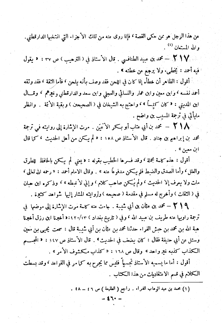 219-محمد بم عثمان بن أبي شيبة . جاءت عنه كلمة مرت الإشارة إلى موضعها في ترجمة راويها عنه طريف بن عبيد الله ، وفي ( تاريخ بغداد ) 13 / 420 : (( أخبرنا ابن رزق معين وسئل عن أبي حنيفة فقال : كان يضعف في الحديث )) . قال الأستاذ ص 147 : (( المجسم الكذاب كذبه غير واحد )) وقال ص 168 : (( كذاب مكشوف الأمر)).