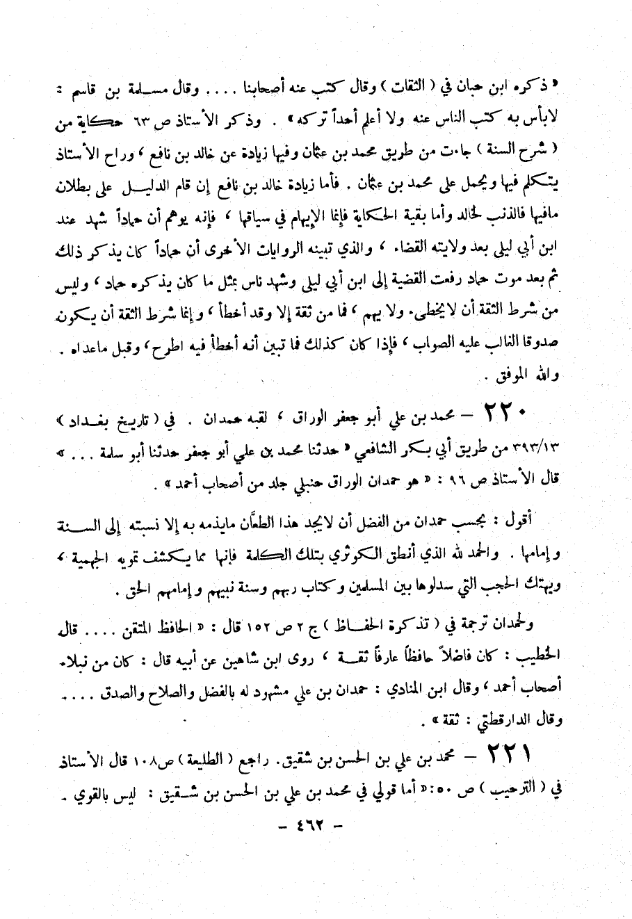 220-محمد بن علي أبو جعفر الوراق ، لقبه حمدان . في ( تاريخ بغداد ) 13 / 393 من طريق أبي بكر الشافعي (( حدثنا محمد بن علي أبو جعفر حدثنا أبو سلمة ... )) قال الأستاذ ص 96 : (( هو حمدان الوراق حنبلي جلد من أصحاب أحمد )) .
