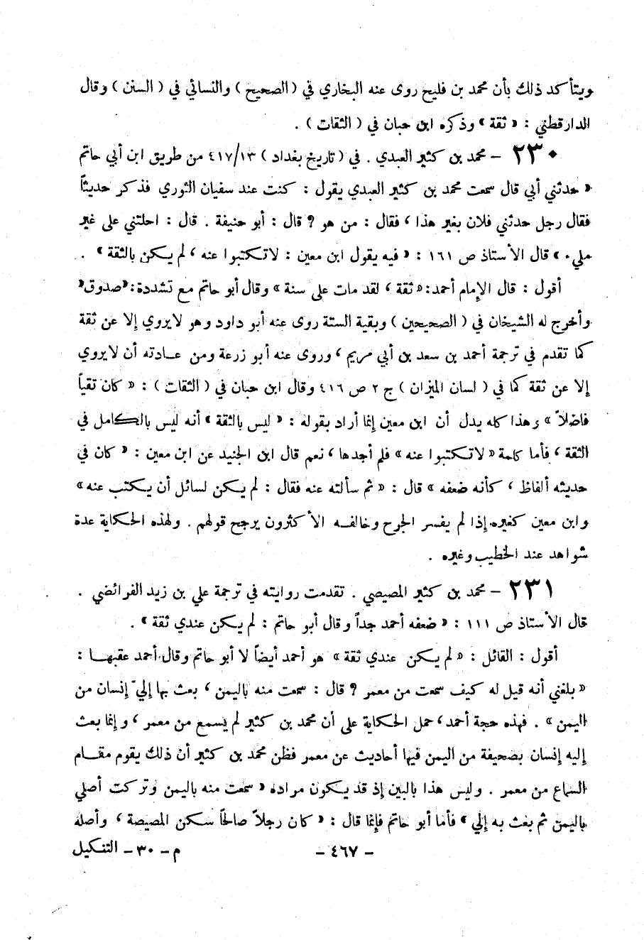 230- محمد بن كثير العبدي . في ( تاريخ بغداد ) 13 / 417 من طريق ابن آبى حاتم (( حدثني آبى قال سمعت محمد بن كثير العبدي يقول : كنت عند سفيان الثوري فذكر حديثا" فقال رجل حدثني فلان بغير هذا ، فقال : من هو ؟ قال : أبو حنيفة . قال : احلتني على غير مليء )) قال الأستاذ ص 161 : (( فيه يقول ابن معين : لا تكتبوا عنه ، لم يكن بالثقة )) .