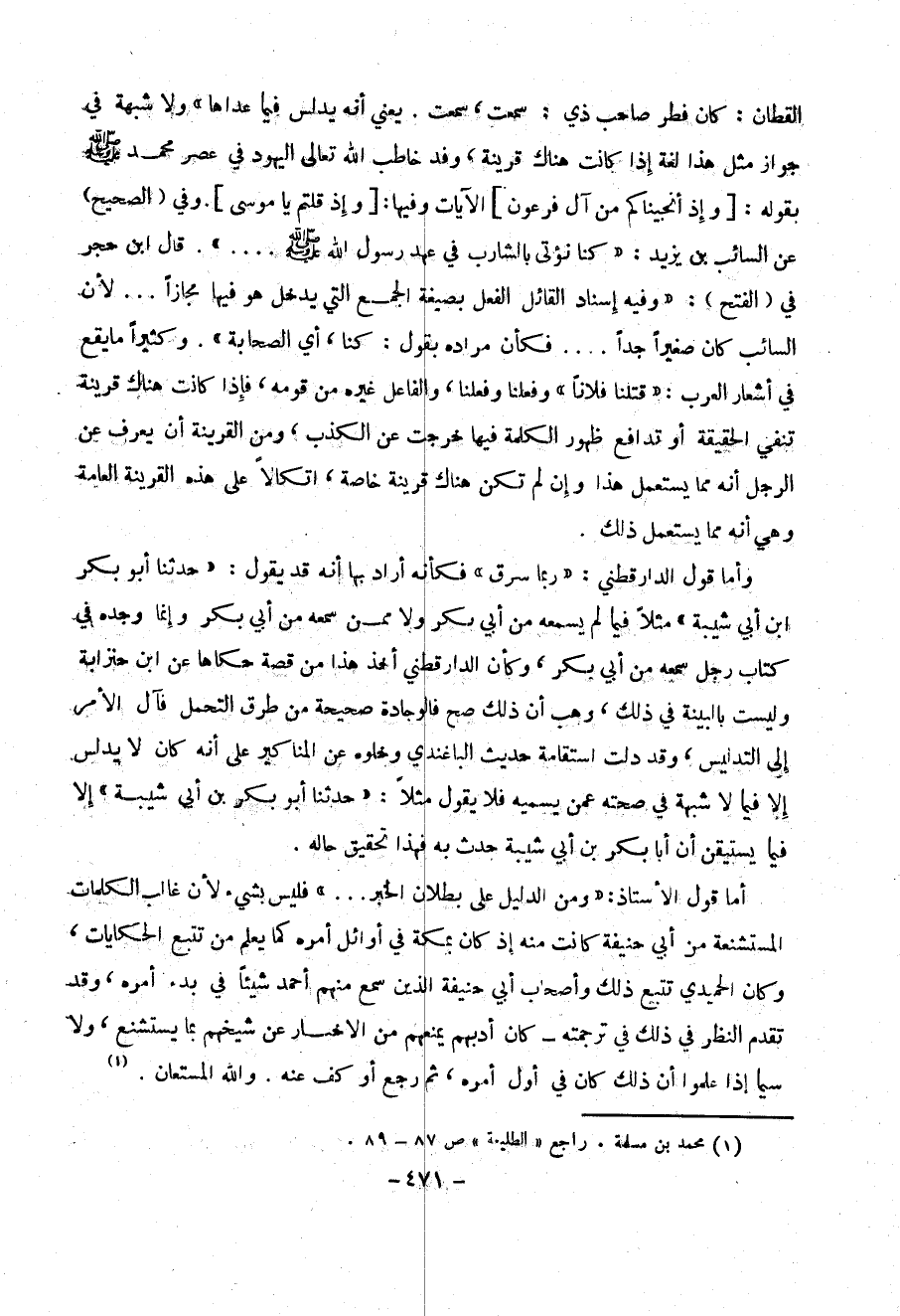 القطان : كان فطر صاحب ذي : سمعت ، سمعت . يعني أنه يدلس فيما عداها )) ولا سبهة في جواز مثل هذا لغة إذا كانت هناك قرينة ، وقد خاطب الله تعالى اليهود في عصر محمد صلى الله عليه وسلم بقوله : [ وغذ أنجيناكم من آل فرعون ] الآيات وفيها : [ وإذ قلتم يا موسى ] وفي ( الصحيح ) عن السائب بن يزيد: (( كنا نؤتي بالشارب في عهد رسول الله صلى الله عليه وسلم .... )) . قال ابن حجر في ( الفتح ) : (( وفيه إسناد القائل الفعل بصيغة الجمع التي هو فيها مجازا" ... لأن السائب كان صغيرا" جدا" .... فكأن مراده بقول : كنا ، أي الصحابة )) . وكثيرا" ما يقع في أشعار العرب : (( قتلنا فلانا" )) وفعلنا وفعلنا ، والفاعل غيره من قومه ، فإذا كانت هناك قرينة تنقي الحقيقة أو تدافع ظهور الكلمة فيها خرجت عن الكذاب ، ومن القرينة أن يعرف عن الرجل انه مما يستعمل هذا وإن لم تكن هناك قرينة خاصة ن اتكالا" على هذه القرينة العمة وهي أنه مما يستعمل ذلك .