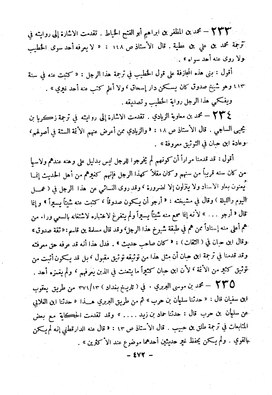 234-محمد بن معاوية الزيادي . تقدمت الإشارة إلى روايته في ترجمة زكريا بن يحيى الساجي . قال الأستاذ ص 18 : (( والزيادي ممن أعرض عنهم الأئمة الستة في أصولهم ن وهادة ابن حبان في التوثيق معروفة )) .