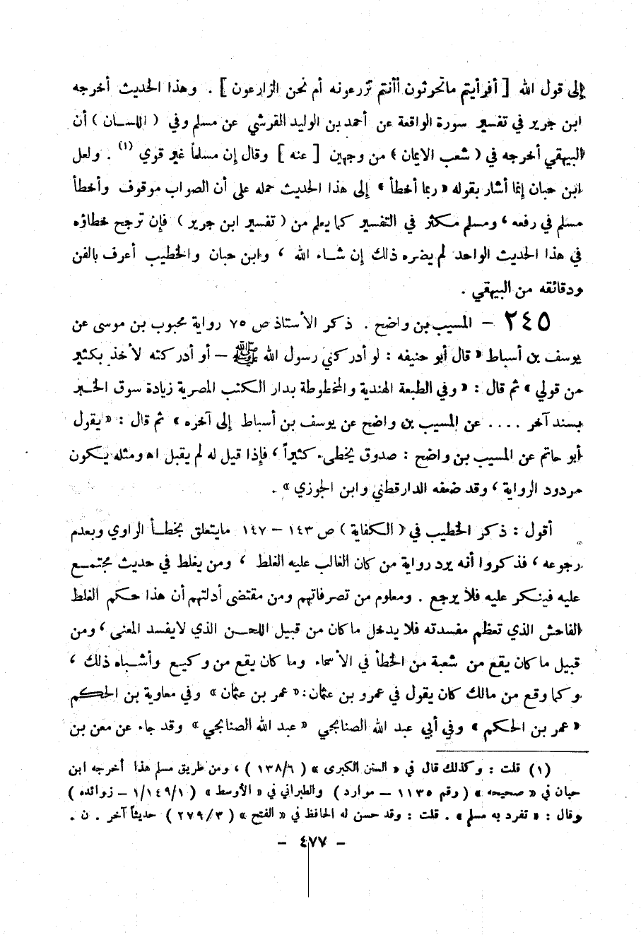 أقول : ذكر الخطيب في ( الكفاية ) ص 143 – 147 ما يتعلق بخطأ الراوي وبعدم رجوعه ، فذكروا أنه يرد رواية من كان الغالب عليه الغلط ، ومن يغلط في حديث مجتمع عليه فينكر عليه فلا يرجع . ومعلوم من تصرفاتهم ومن مقتضى أدلتهم أن هذا حكم الغلط الفاحش الذي تعظم مفسدته فلا يدخل ما كان من قبيل اللحن الذي لا يفسد المعنى ، ومن قبيل ما كان يقع من شعبة من الخطأ في الأسماء وما كان يقع من وكيع وأشباه ذلك ، وكما وقع من مالك كان يقول في عمرو بن عثمان : (( عمر بن عثمان )) وفي معاوية بن الحكم (( عمر بن الحكم )) وفي أبي عبد الله الصنابجي (( عبد الله الصنابجي )) وقد جاء عن معن بن