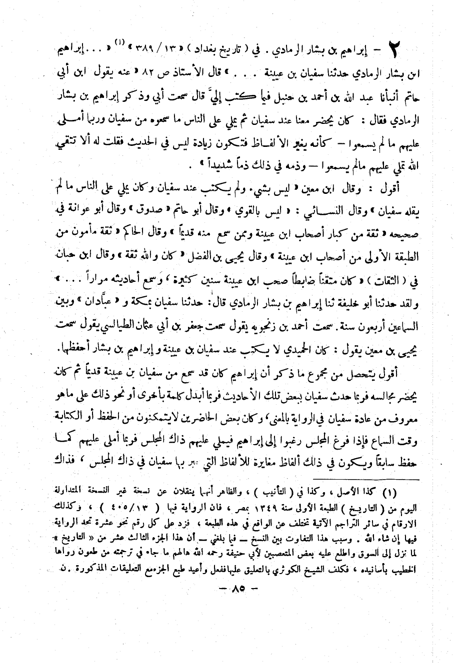 2 - إبراهيم بن بشار الرمادي. في (تاريخ بغداد) ((13م 389)) (1) (( ... إبراهيم ابن بشار الرمادي حدثنا سفيان بن عيينة ... )) قال الأستاذ ص 82 ((عنه يقول ابن أبي حاتم أنبأنا عبد الله بن أحمد بن حنبل فيما كتب إلي قال سمعت أبي وذكر إبراهيم بن بشار الرمادي فقال ك كان يحضر معنا عند سفيان ثم يملي على الناس ما سمعوه من سفيان وربما أملي عليهم ما لم يسمعوا - كأنه يغير الألفاظ فتكون زيادة ليس في الحديث فقلت له إلا تثقي الله تملي عليهم ما لم يسمعوا - وذمة في ذلك ذماً شديداً)).