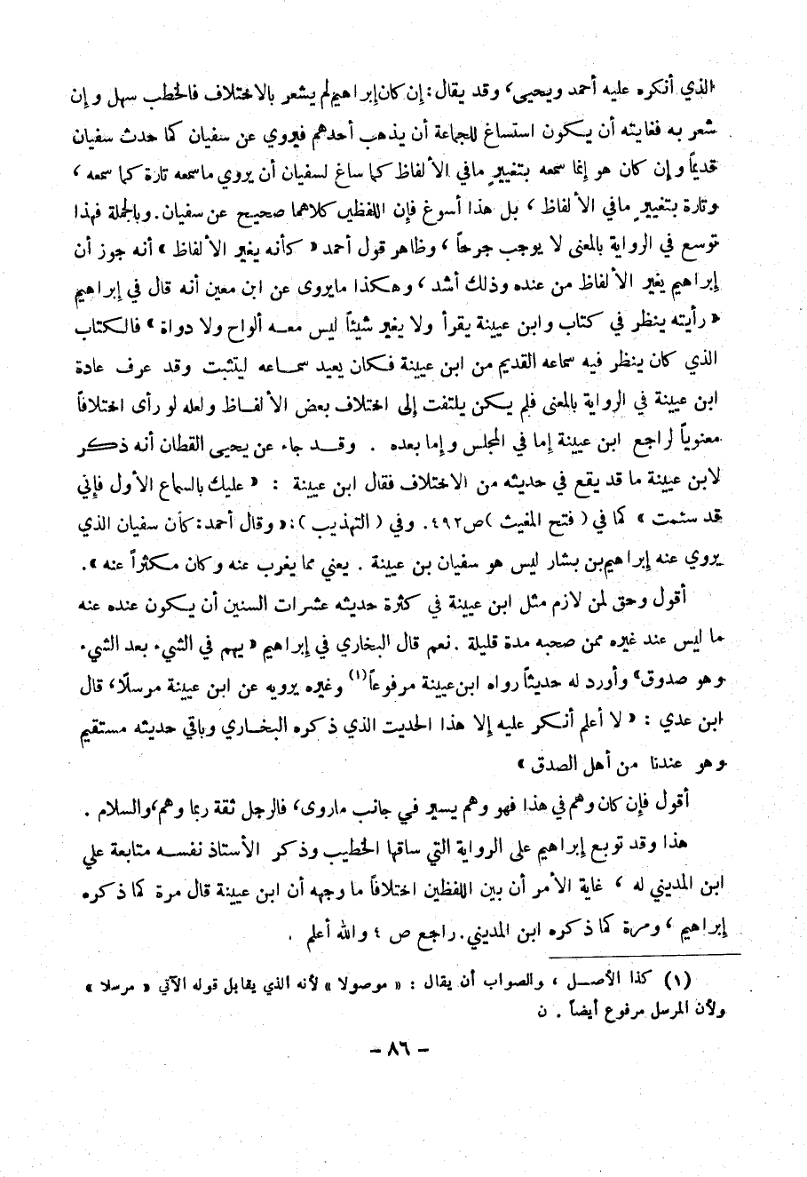 هذا وقد توبع إبراهيم على الرواية التي ساقها الخطيب وذكر الأستاذ نفسه متابعة علي ابن المديني له غاية الأمر أن بين اللفظيين اختلافا ما وجهه أن ابن عيينة قال مرة كما ذكره إبراهيم ومرة كما ذكر ابن المديني. راجع ص 4 والله أعلم.