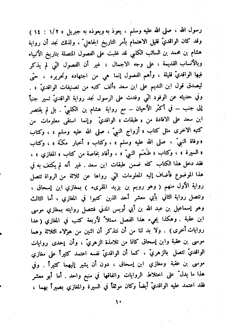 عما وراء ذلك إلى إسماعيل بن إبراهيم " (1) . وهو يذكر رواية ابن الكلبي أن والد الرسول توفي بعد ما أتى على الرسول ثمانية وعشرون شهراً، ويقال سبعة اشهر ثم يعلق على ذلك بقوله: " والأول أثبت أنه توفي ورسول الله، صلى الله عليه وسلم، حمل " (2) وأورد رواية يستفاد منها أن النبي بكى عند قبر أمه لما فتح مكة فقال " وهذا غلط وليس قبرها بمكة، وقبرها بالأبواء " (3) . وقال في موطن آخر يذكر وفاة حميد بن عبد الرحمن: " وقد سمعت من يذكر أنه توفي سنة خمس ومائة وهذا غلط وخطأ ليس يمكن أن يكون ذلك كذلك، لا في سنة ولا في روايته، وخمس وتسعون أشبه واقرب إلى الصواب " (4) . ونقل عن هشام الكلبي قوله إن الذي حضر بدراً هو السائب ابن مظعون (لا السائب بن عثمان بن مظعون) فقال في التعليق عليه: " وذلك عندنا منه وهل لأن أصحاب السيرة ومن يعلم المغازي يثبتون السائب الخ " (5) . وهو يضعف شعراً يرويه (6) ، وروايته للشعر وبخاصة في السيرة، ليست قليلة، ولكنها في باب المغازي مثلاً أقل بكثير مما رواه الواقدي أو ابن إسحاق. وهذا الميل النقدي الذي تصوره هذه النصوص موجود عند أستاذه الواقدي أيضاً.