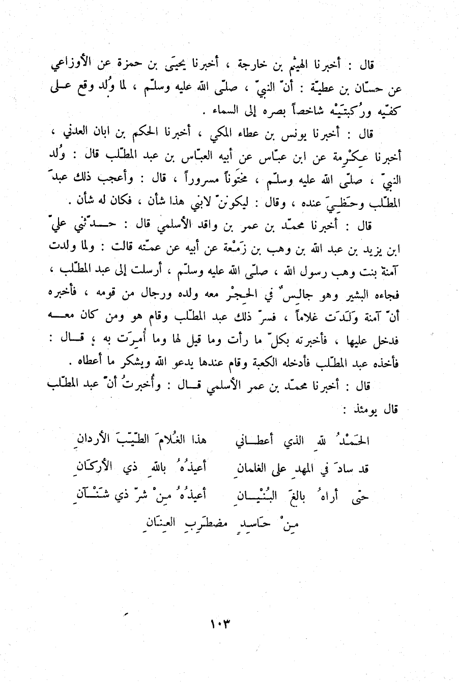 قَالَ: أَخْبَرَنَا يُونُسُ بْنُ عَطَاءٍ الْمَكِّيُّ، أَخْبَرَنَا الْحَكَمُ بْنُ أَبَانَ الْعَدَنِيُّ، أَخْبَرَنَا عِكْرِمَةُ، عَنِ ابْنِ عَبَّاسٍ، عَنْ أَبِيهِ الْعَبَّاسِ بْنِ عَبْدِ الْمُطَّلِبِ قَالَ: §وُلِدَ النَّبِيُّ صلّى الله عليه وسلم مَخْتُونًا مَسْرُورًا، قَالَ: وَأَعْجَبَ ذَلِكَ عَبْدَ الْمُطَّلِبِ وَحَظِيَ عِنْدَهُ، وَقَالَ: لَيَكُونَنَّ لِابْنِي هَذَا شَأْنٌ فَكَانَ لَهُ شَأْنٌ