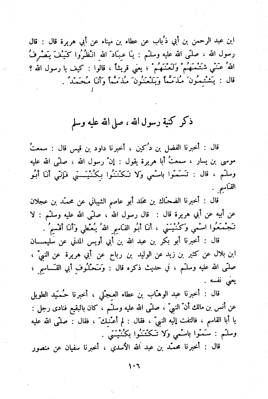 قَالَ: أَخْبَرَنَا الْفَضْلُ بْنُ دُكَيْنٍ، أَخْبَرَنَا دَاوُدُ بْنُ قَيْسٍ قَالَ: سَمِعْتُ مُوسَى بْنَ يَسَارٍ، سَمِعْتُ أَبَا هُرَيْرَةَ يَقُولُ: إِنَّ رَسُولَ اللَّهِ صلّى الله عليه وسلم قَالَ: «§تَسَمَّوْا بِاسْمِي وَلَا تَكْتَنُوا بِكُنْيَتِي فَإِنِّي أَنَا أَبُو الْقَاسِمِ»