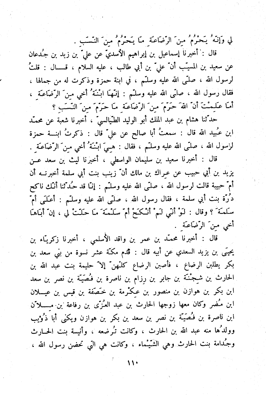 قَالَ: أَخْبَرَنَا إِسْمَاعِيلُ بْنُ إِبْرَاهِيمَ الْأَسَدِيُّ، عَنْ عَلِيِّ بْنِ زَيْدِ بْنِ جُدْعَانَ، عَنْ سَعِيدِ بْنِ الْمُسَيِّبِ، أَنَّ عَلِيَّ بْنَ أَبِي طَالِبٍ، عَلَيْهِ السَّلَامُ قَالَ: قُلْتُ لِرَسُولِ اللَّهِ صلّى الله عليه وسلم فِي ابْنَةِ حَمْزَةَ وَذَكَرْتُ لَهُ مِنْ جَمَالِهَا فَقَالَ رَسُولُ اللَّهِ صلّى الله عليه وسلم: «إِنَّهَا §ابْنَةُ أَخِي مِنَ الرَّضَاعَةِ أَمَا عَلِمْتَ أَنَّ اللَّهَ حَرَّمَ مِنَ الرَّضَاعَةِ مَا حَرَّمَ مِنَ النَّسَبِ؟»