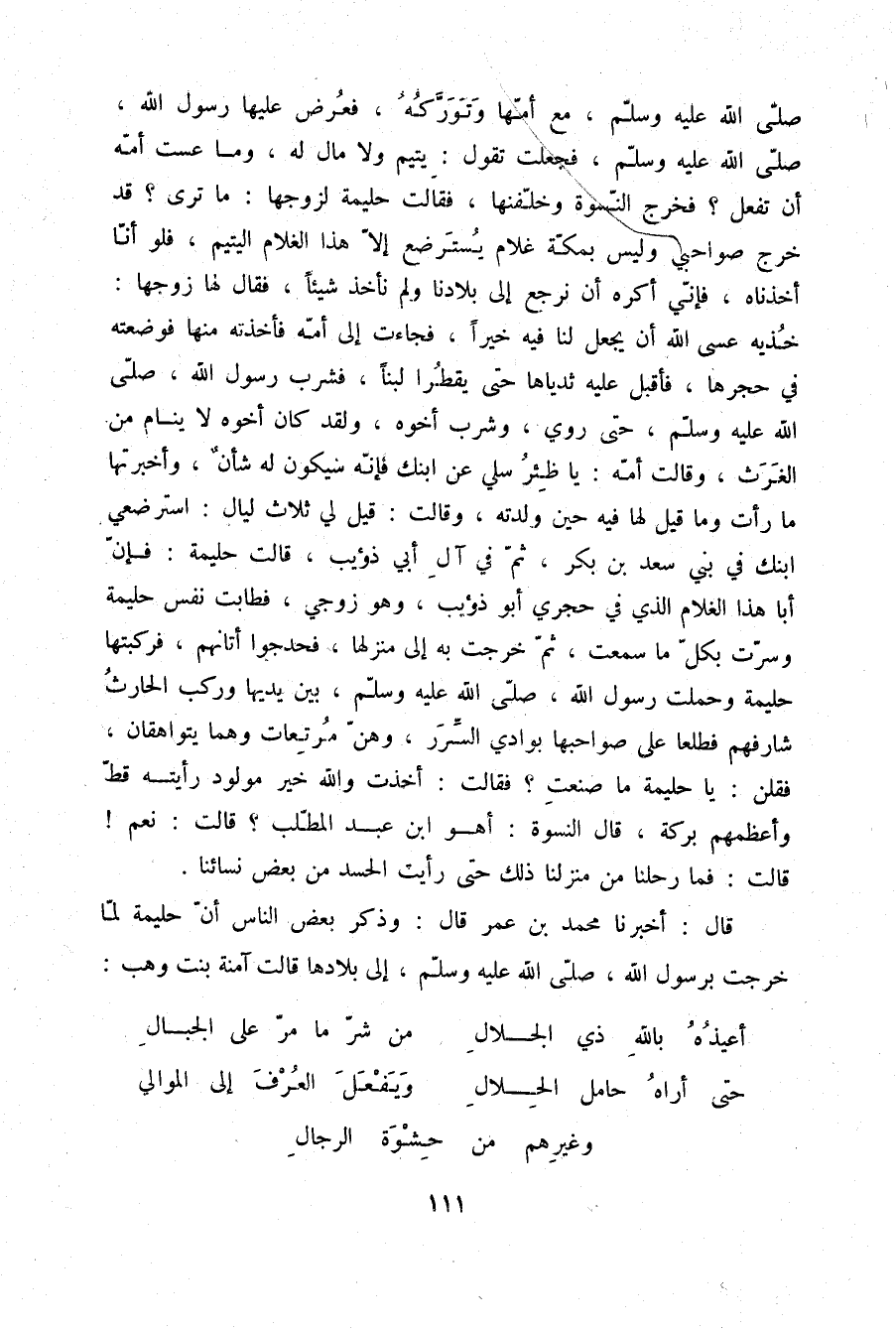 صلّى الله عليه وسلم مَعَ أُمِّهَا وَتُوَرِّكُهُ فَعُرِضَ عَلَيْهَا رَسُولُ اللَّهِ صلّى الله عليه وسلم فَجَعَلَتْ تَقُولُ: يَتِيمٌ وَلَا مَالَ لَهُ وَمَا عَسَتْ أُمُّهُ أَنْ تَفْعَلَ، فَخَرَجَ النِّسْوَةُ وَخَلَّفْنَهَا، فَقَالَتْ حَلِيمَةُ لِزَوْجِهَا: مَا تَرَى؟ قَدْ خَرَجَ صَوَاحِبِي وَلَيْسَ بِمَكَّةَ غُلَامٌ يُسْتَرْضَعُ إِلَّا هَذَا الْغُلَامُ الْيَتِيمُ، فَلَوْ أَنَّا أَخَذْنَاهُ فَإِنِّي أَكْرَهُ أَنْ نَرْجِعَ إِلَى بِلَادِنَا وَلَمْ نَأْخُذْ شَيْئًا، فَقَالَ لَهَا زَوْجُهَا: خُذِيهِ عَسَى اللَّهُ أَنْ يَجْعَلَ لَنَا فِيهِ خَيْرًا، فَجَاءَتْ إِلَى أُمِّهِ فَأَخَذَتْهُ مِنْهَا فَوَضَعَتْهُ فِي حِجْرِهَا فَأَقْبَلَ عَلَيْهِ ثَدْيَاهَا حَتَّى يَقْطُرَا لَبَنًا، فَشَرِبَ رَسُولُ اللَّهِ صلّى الله عليه وسلم حَتَّى رُوِيَ وَشَرِبَ أَخُوهُ وَلَقَدْ كَانَ أَخُوهُ لَا يَنَامُ مِنَ الْغَرَثِ، وَقَالَتْ أُمُّهُ: يَا ظِئْرُ سَلِي عَنِ ابْنِكِ فَإِنَّهُ سَيَكُونُ لَهُ شَأْنٌ وَأَخْبَرَتْهَا مَا رَأَتْ وَمَا قِيلَ لَهَا فِيهِ حِينَ وَلَدَتْهُ، وَقَالَتْ: قِيلَ لِي ثَلَاثَ لَيَالٍ: اسْتَرْضِعِي ابْنَكِ فِي بَنِي سَعْدِ بْنِ بَكْرٍ ثُمَّ فِي آلِ أَبِي ذُؤَيْبٍ، قَالَتْ حَلِيمَةُ: فَإِنَّ أَبَا هَذَا الْغُلَامِ الَّذِي فِي حِجْرِي أَبُو ذُؤَيْبٍ وَهُوَ زَوْجِي، فَطَابَتْ نَفْسُ حَلِيمَةَ، وَسُرَّتْ بِكُلِّ مَا سَمِعَتْ، ثُمَّ خَرَجَتْ بِهِ إِلَى مَنْزِلِهَا فَحَدَجُوا أَتَانَهُمْ فَرَكِبَتْهَا حَلِيمَةُ وَحَمَلَتْ رَسُولَ اللَّهِ صلّى الله عليه وسلم بَيْنَ يَدَيْهَا وَرَكِبَ الْحَارِثُ شَارِفَهُمْ فَطَلَعَا عَلَى صَوَاحِبِهَا بِوَادِي السِّرَرِ، وَهُنَّ مُرْتِعَاتٌ وَهُمَا يَتَوَاهَقَانِ فَقُلْنَ: يَا حَلِيمَةُ مَا صَنَعْتِ؟ فَقَالَتْ: §أَخَذْتُ وَاللَّهِ خَيْرَ مَوْلُودٍ رَأَيْتُهُ قَطُّ، وَأَعْظَمَهُمْ بَرَكَةً، قَالَ النِّسْوَةُ: أَهُوَ ابْنُ عَبْدِ الْمُطَّلِبِ؟ قَالَتْ: نَعَمْ قَالَتْ: فَمَا رَحَلْنَا مِنْ مَنْزِلِنَا ذَلِكَ حَتَّى رَأَيْتُ الْحَسَدَ مِنْ بَعْضِ نِسَائِنَا