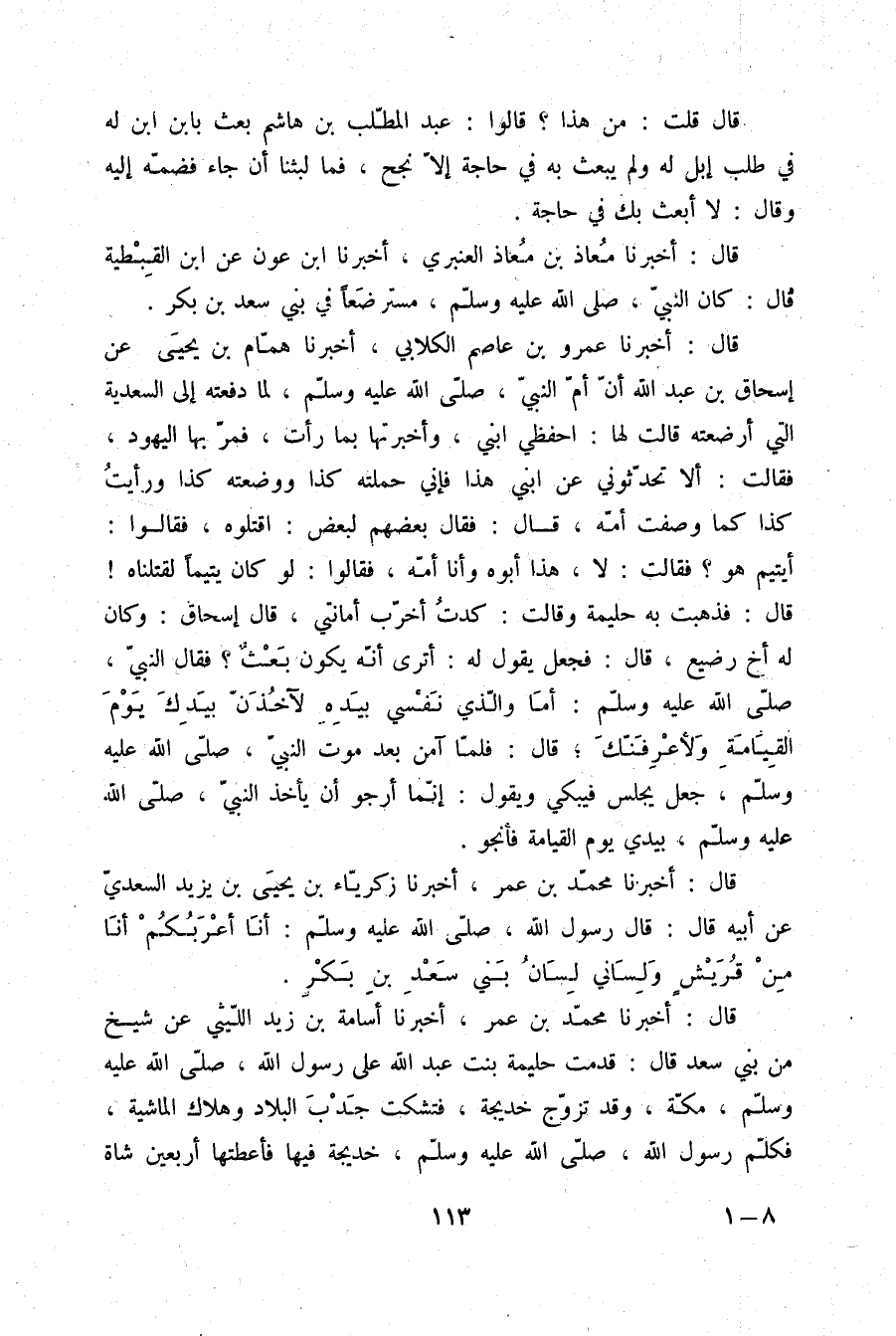 قَالَ: أَخْبَرَنَا مُحَمَّدُ بْنُ عُمَرَ، أَخْبَرَنَا أُسَامَةُ بْنُ زَيْدٍ اللَّيْثِيُّ، عَنْ شَيْخٍ مِنْ بَنِي سَعْدٍ قَالَ: " قَدِمَتْ حَلِيمَةُ بِنْتُ عَبْدِ اللَّهِ عَلَى رَسُولِ اللَّهِ صلّى الله عليه وسلم مَكَّةَ وَقَدْ تَزَوَّجَ خَدِيجَةَ فَتَشَكَّتْ جَدْبَ الْبِلَادِ وَهَلَاكَ الْمَاشِيَةِ، §فَكَلَّمَ رَسُولُ اللَّهِ صلّى الله عليه وسلم خَدِيجَةَ فِيهَا، فَأَعْطَتْهَا أَرْبَعِينَ شَاةً -[114]- وَبَعِيرًا مَوَقَّعًا لِلظَّعِينَةِ وَانْصَرَفَتْ إِلَى أَهْلِهَا